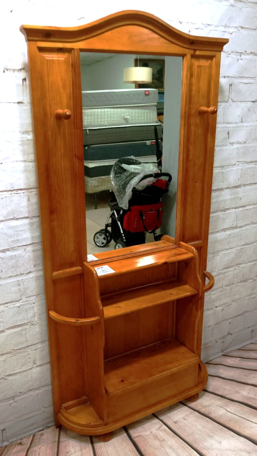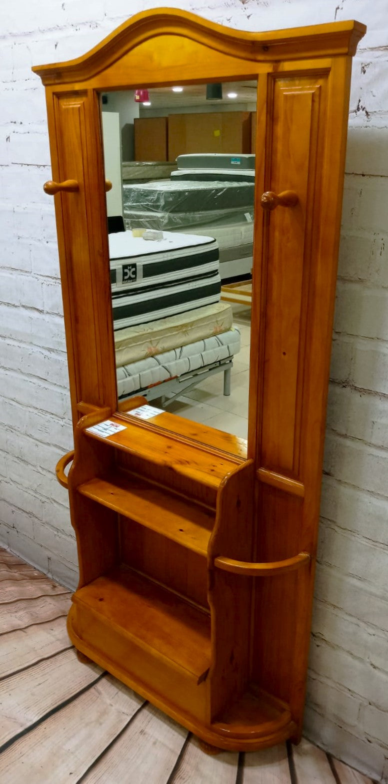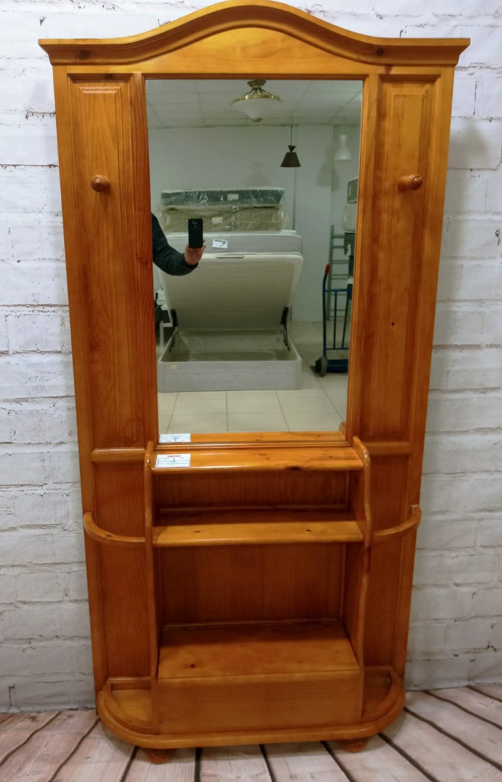 Descripción Mueble de estilo rústico, hecho de madera de pino maciza. Frontal con espejo y un perchero a cada costado. Bajo con dos paragüeros y estanterías.