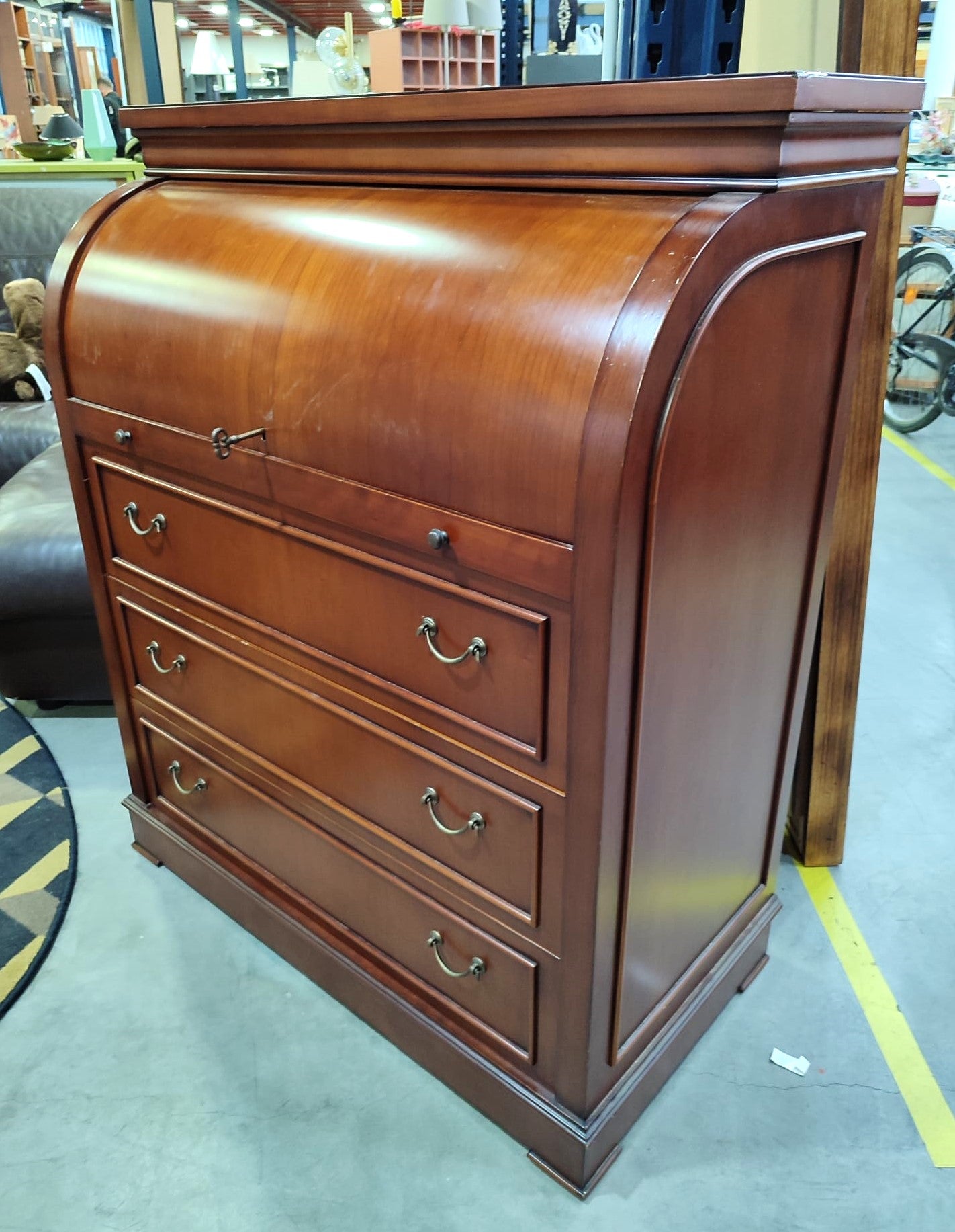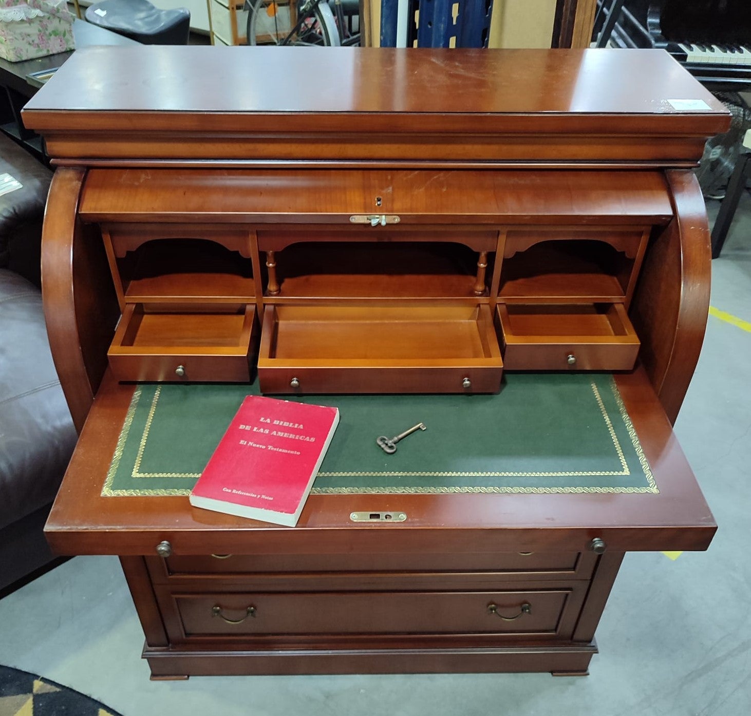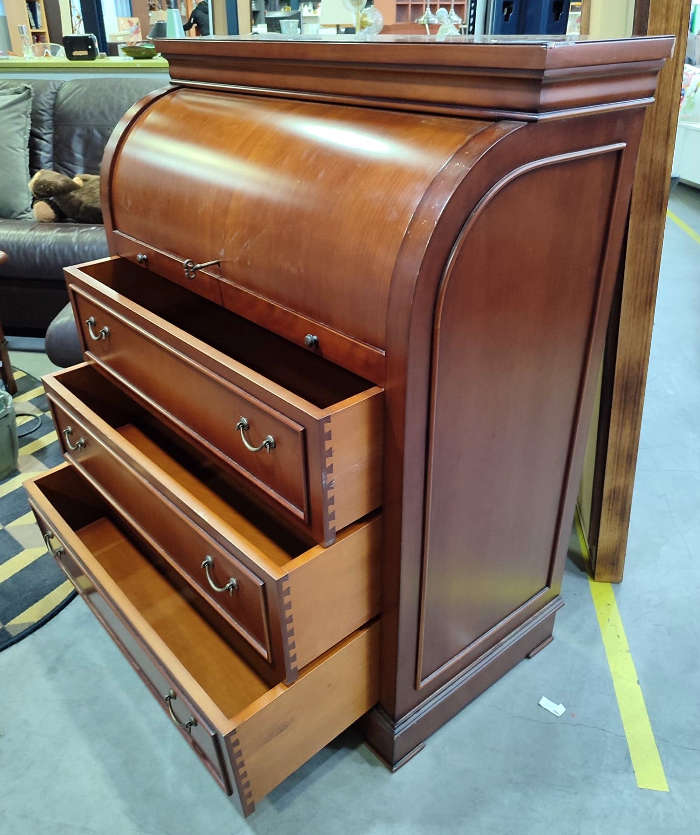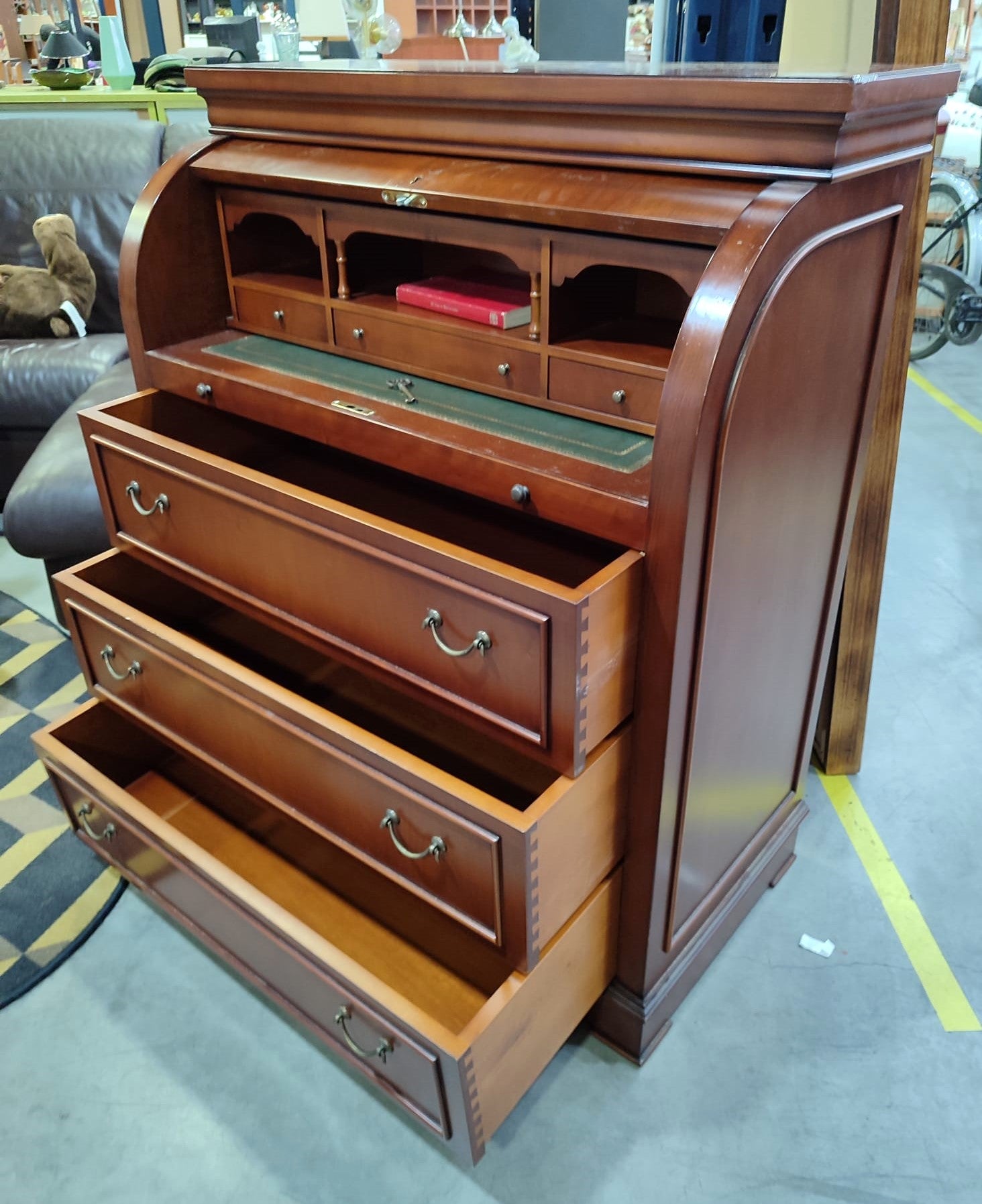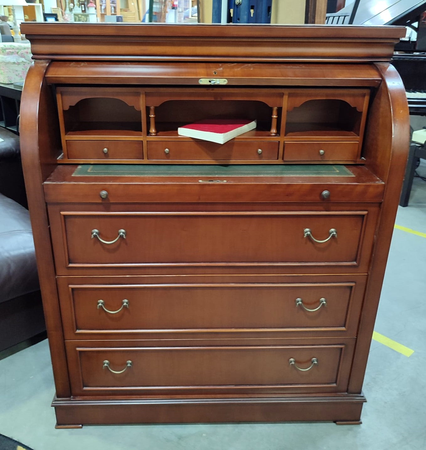 Descripción Mueble de madera maciza con acabado de melamina. Estilo industrial. Persiana de tambor con cerradura y llave incluida. Escritorio extraíble con pequeños cajones y compartimentos para utensilios de papelería. 3 amplios cajones inferiores.