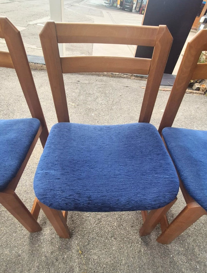 Descripción Conjunto de sillas hechas de madera. Respaldo alto y abierto. Asiento acolchado. Tapizado de chenilla.