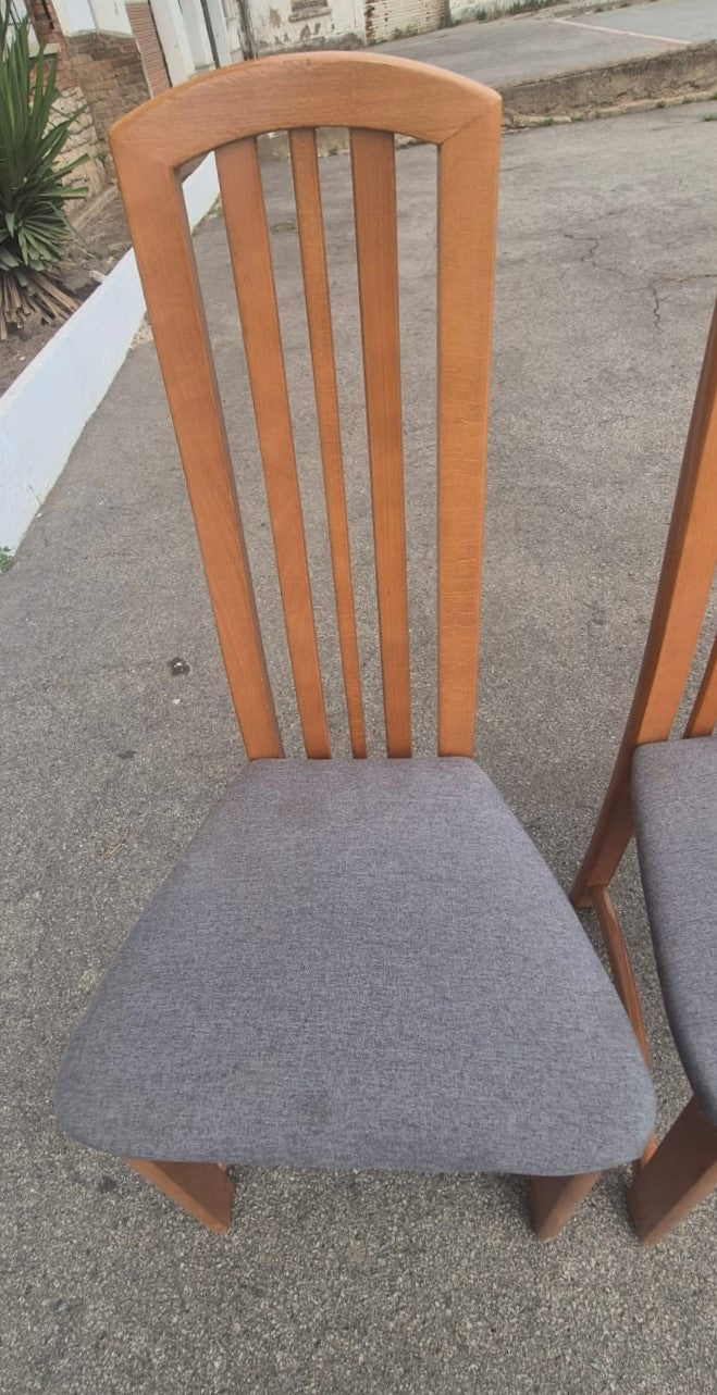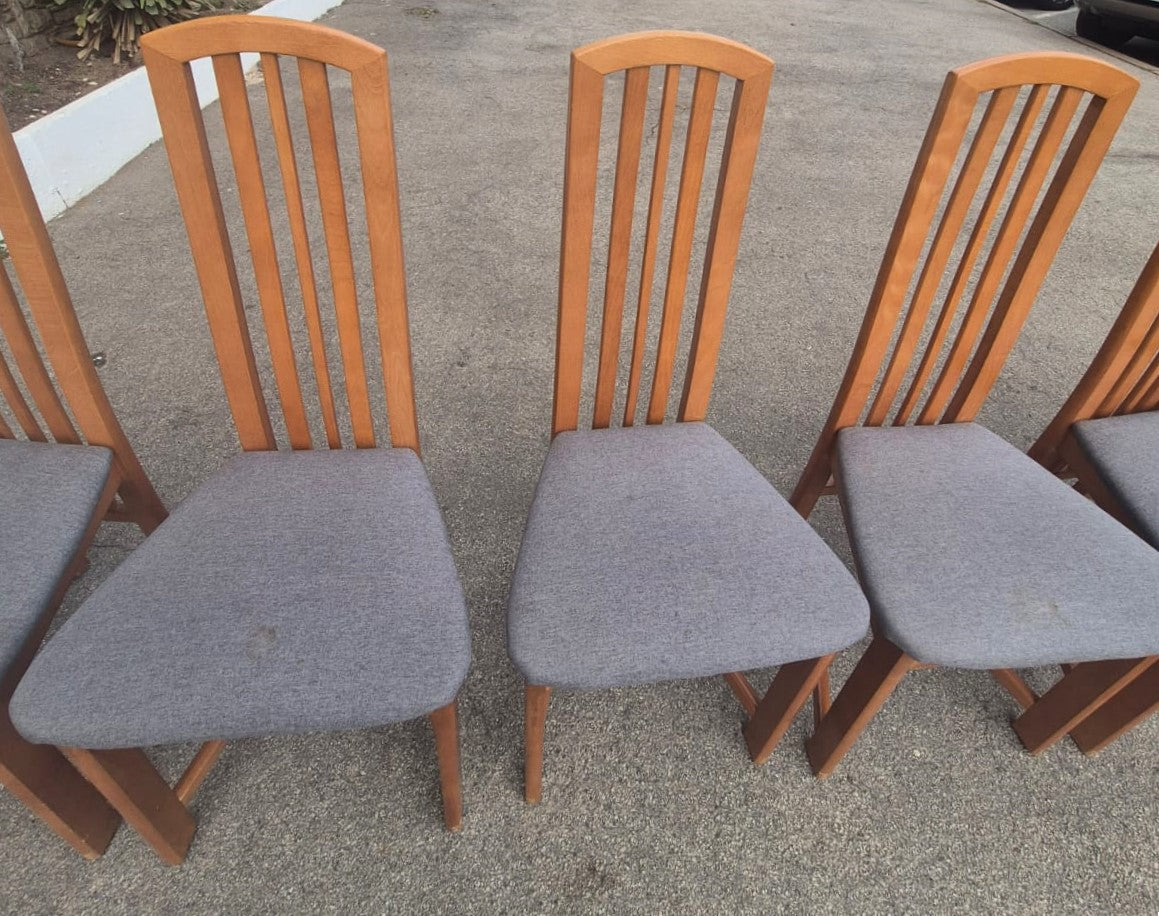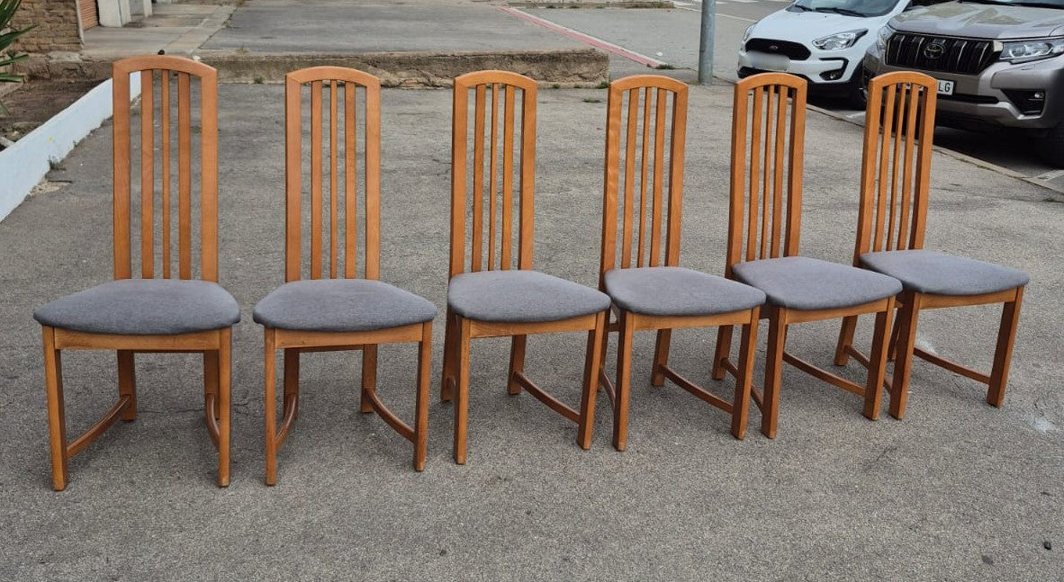 Descripción Conjunto de 6 sillas de comedor hechas de madera. Respaldo alto y abierto. Asiento acolchado. Tapizado de tela. Defecto: Tienen algunas manchas en el tapizado. ver fotos
