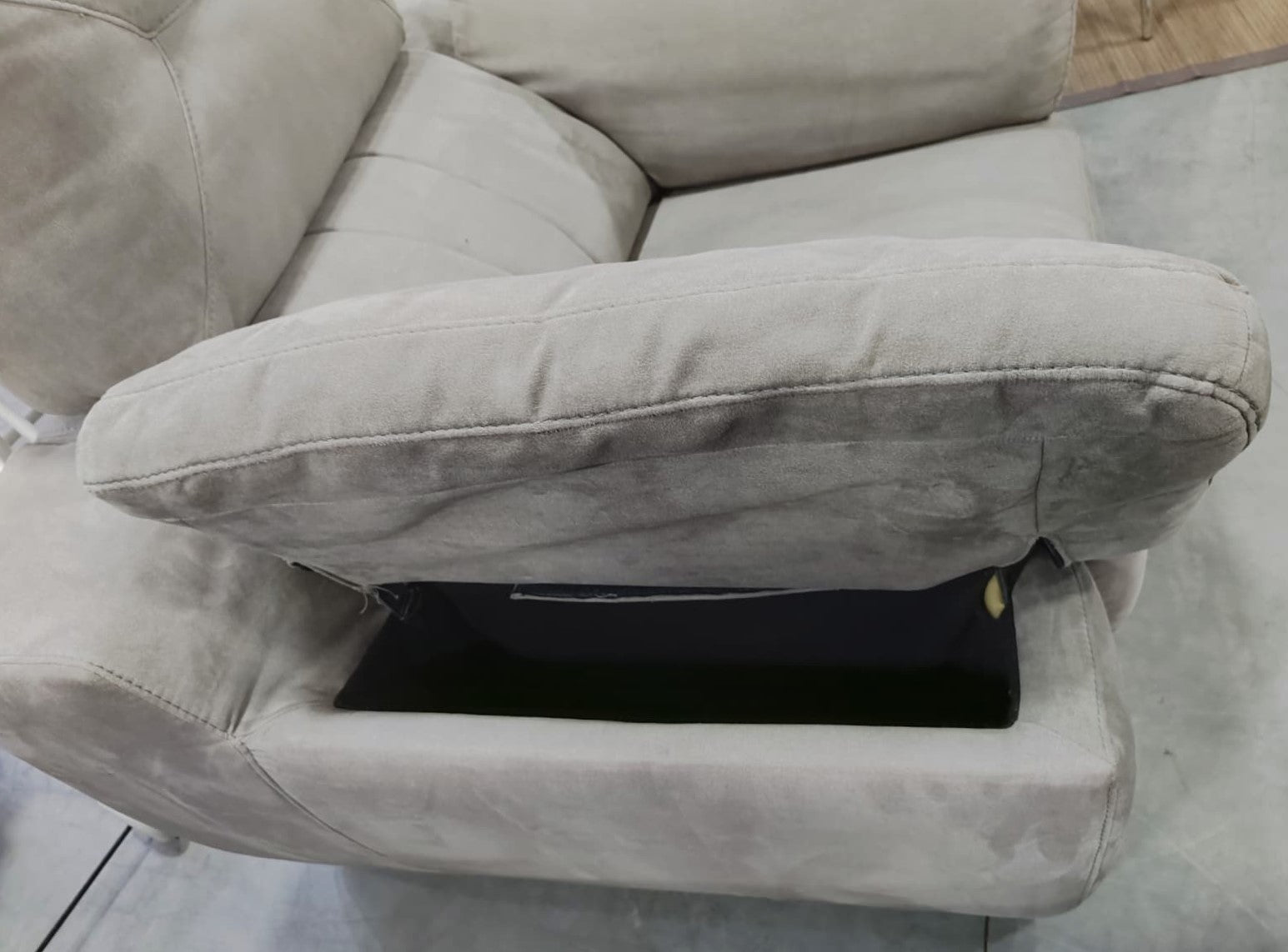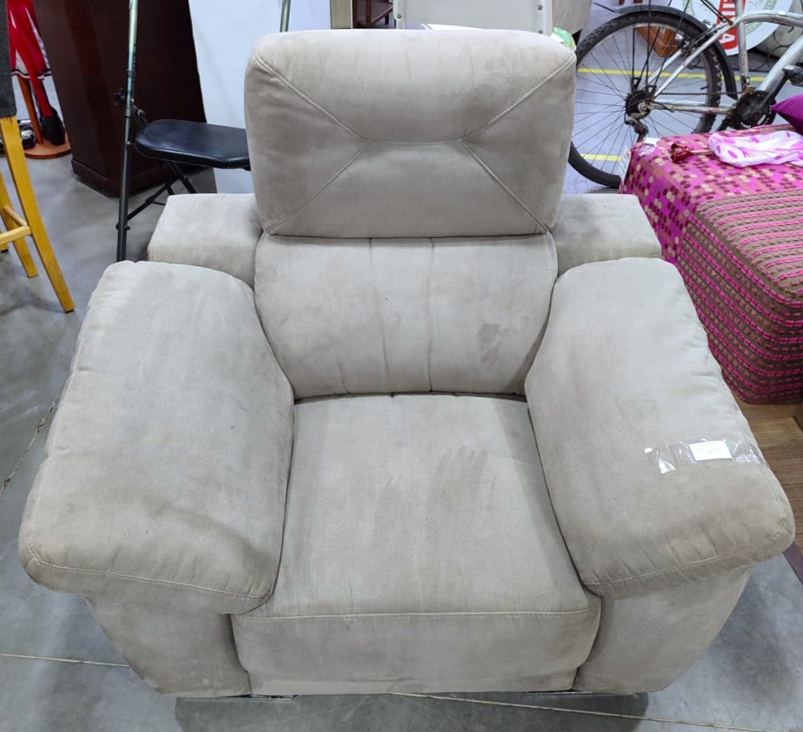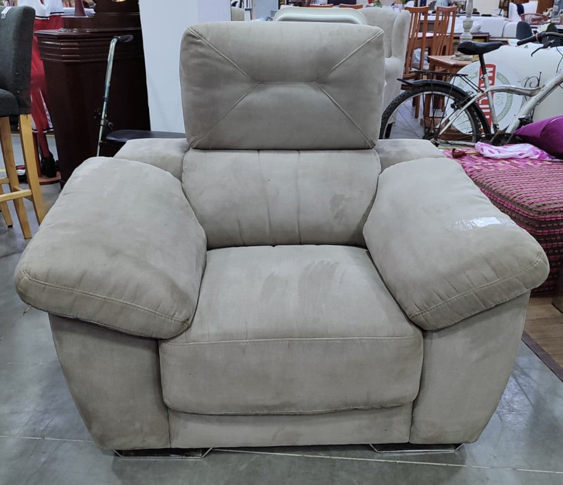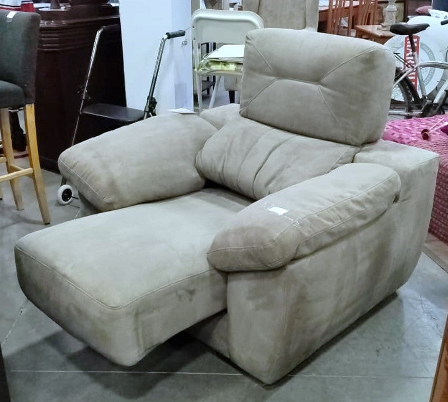 Descripción Sofá ancho, muy cómodo, ergonómico, ideal para facilitar el descanso. Respaldo alto de doble cojín. Apoyabrazos anchos y suaves, cada uno da acceso a un baúl interior si se levantan. Asiento de espuma de firmeza media. Extraíble para poder tumbarse. Tapizado de tela magnolia, suave al tacto y resistente a manchas, color gris. Defecto: Tiene unas pequeñas manchitas, ver fotos.