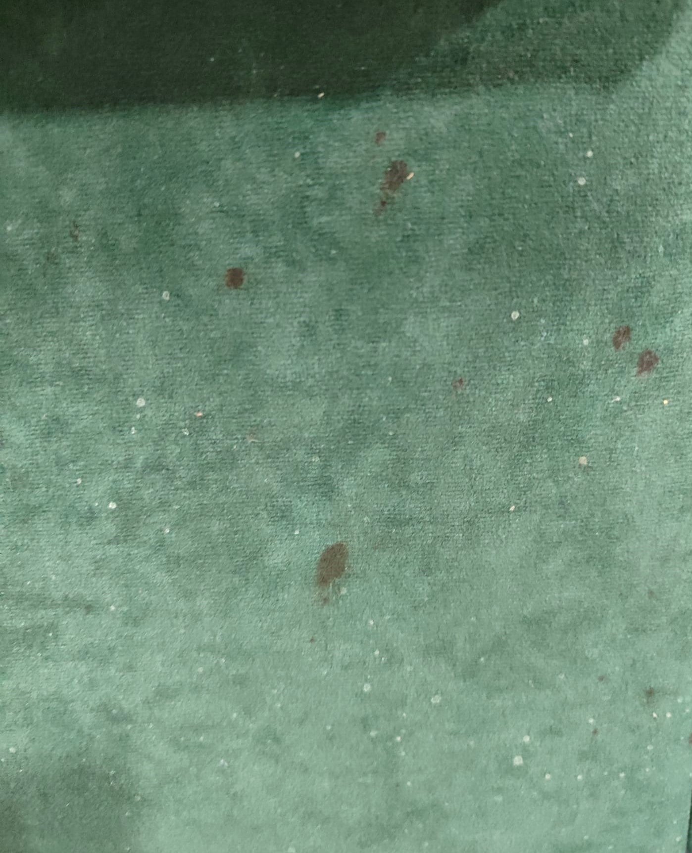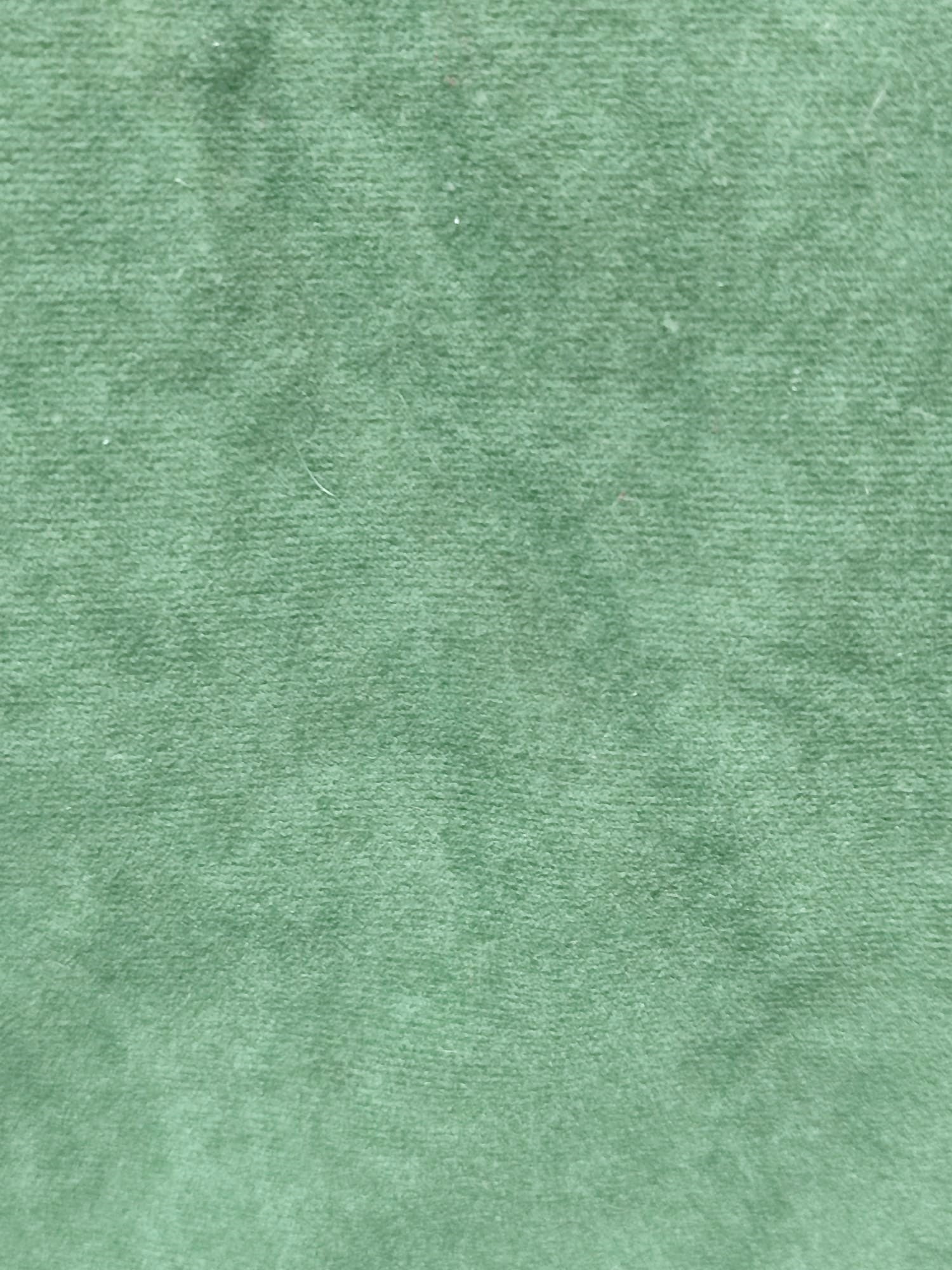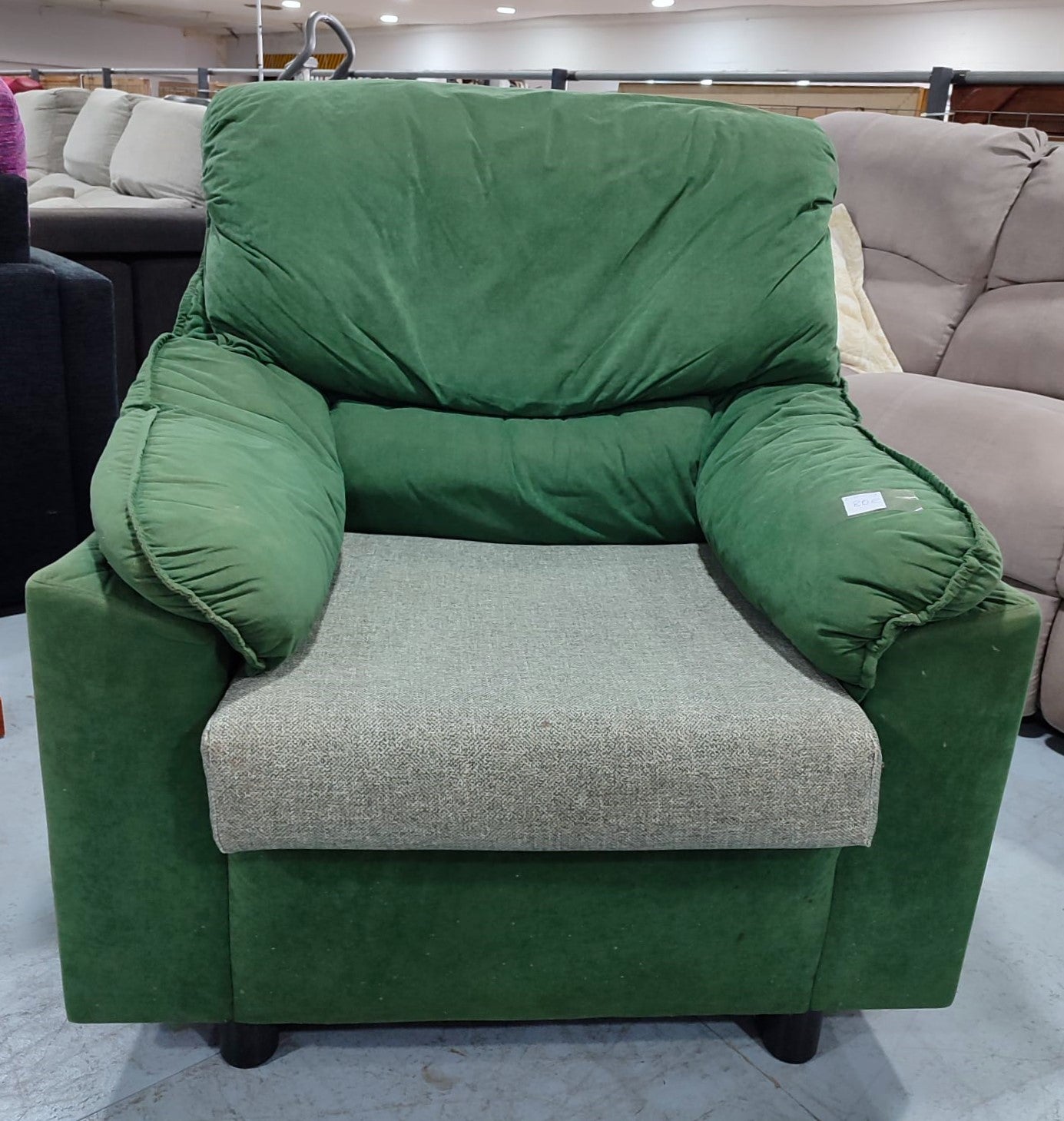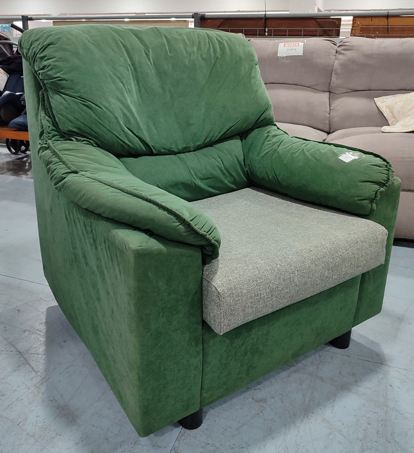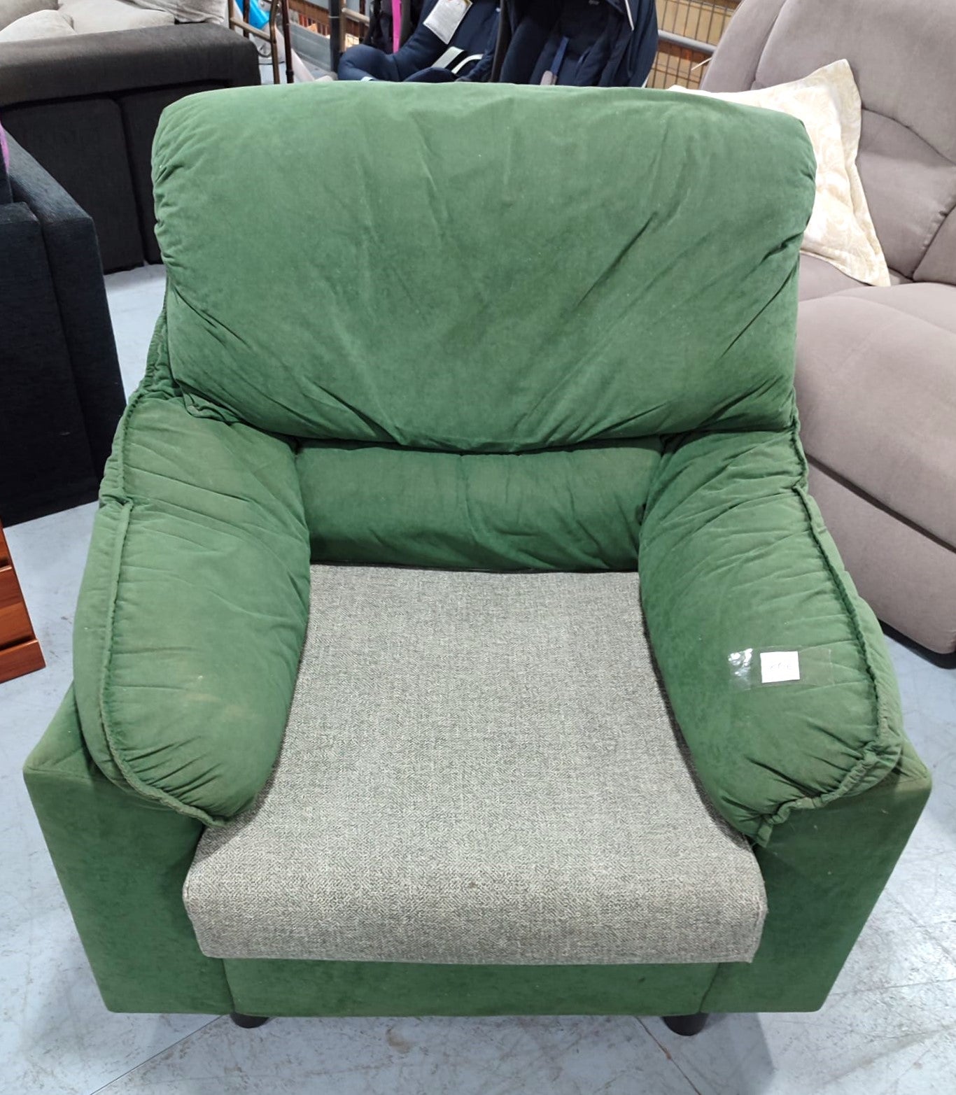 Descripción Sillón clásico. Respaldo alto de doble cojín con reposabrazos acolchados. Asiento de espuma de densidad media. Todos los cojines son extraíbles y desenfundable para facilitar su limpieza. Tapizado de chenilla y terciopelo color verde. Defecto: El tapizado tiene algunas manchas. ver fotos.