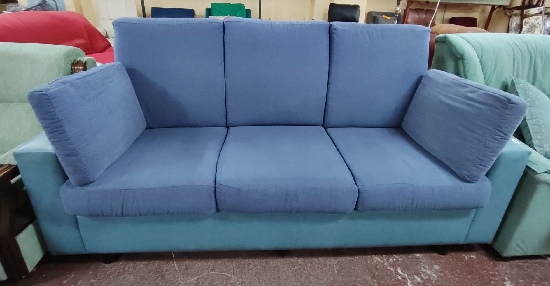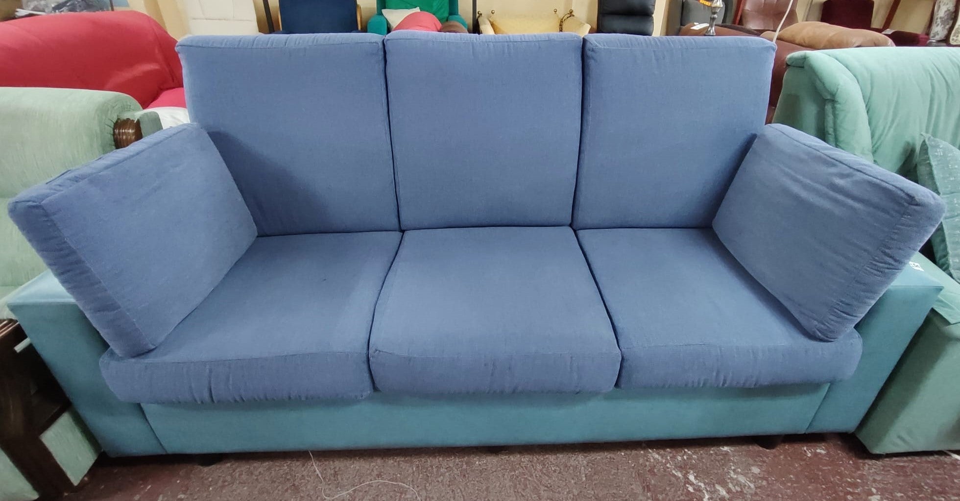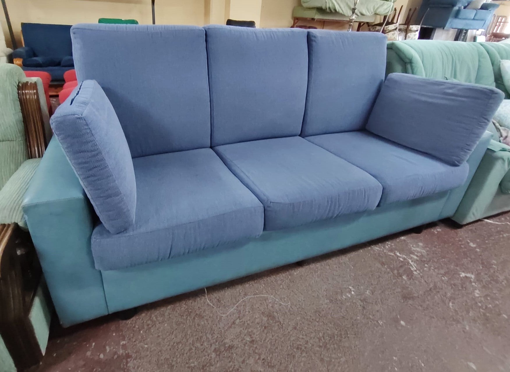 Forma del producto SOFÁ 3 PLAZAS 198x80x100 cm €150,00IVA incluido SKU: MR-F0029714-E Recogida gratuita en nuestra(s) tienda(s) Contáctanos por WhatsApp Estado: En buen estadoMedidas: Largo 198 cm, Profundidad 80 cm, Alto 100 cm.Color: Azul celeste y AzulDefecto: sí tiene