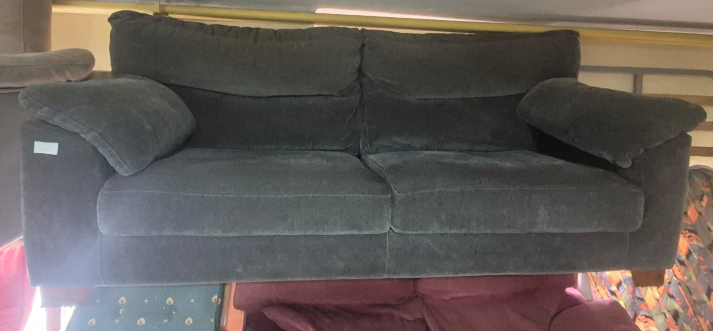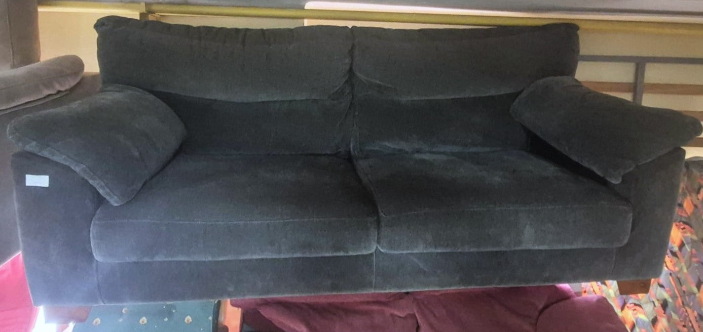 Descripción Sofá espacioso, muy cómodo. Respaldo alto con cojines en los reposabrazos. Asientos rellenos de espuma con firmeza media. Desenfundables. Tapizado de chenilla color antracita.