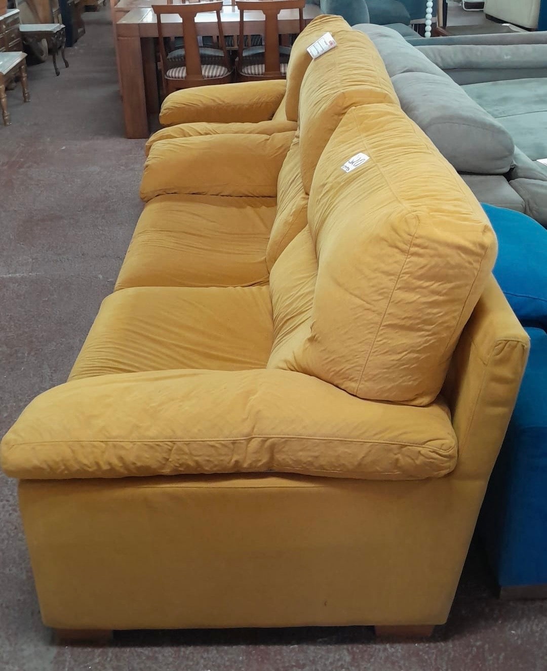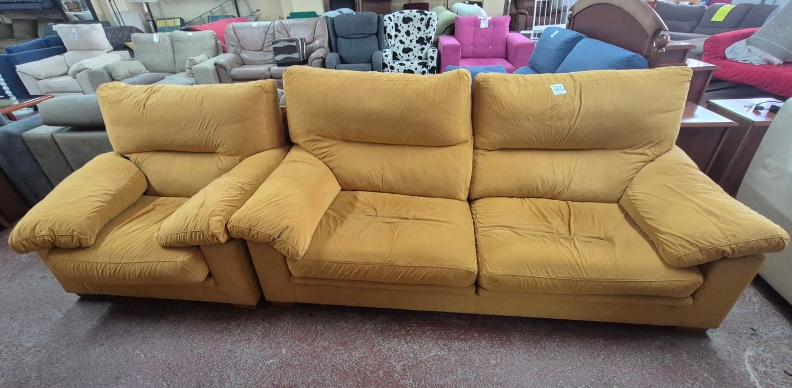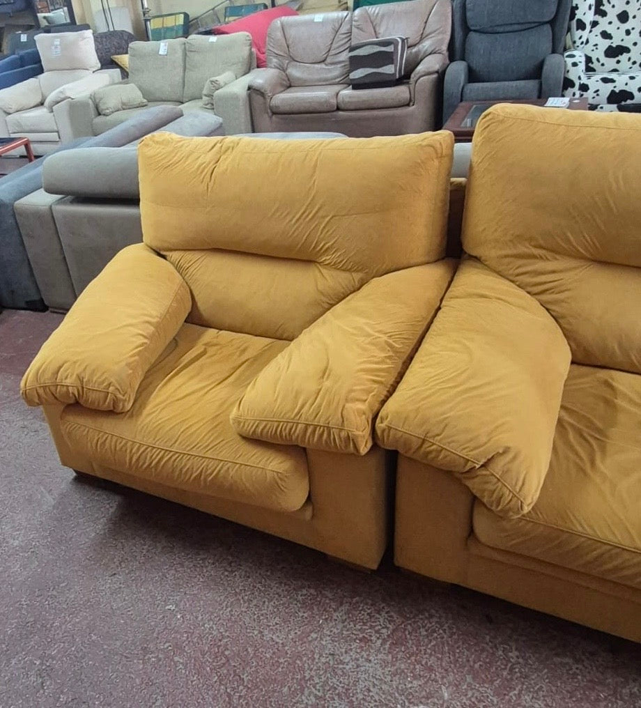 Descripción Butaca y sofá tapizados con tela amarillo mostaza suave al tacto Esponja de densidad baja DEFECTOS DE USO MANCHAS EN LA TAPICERÍA