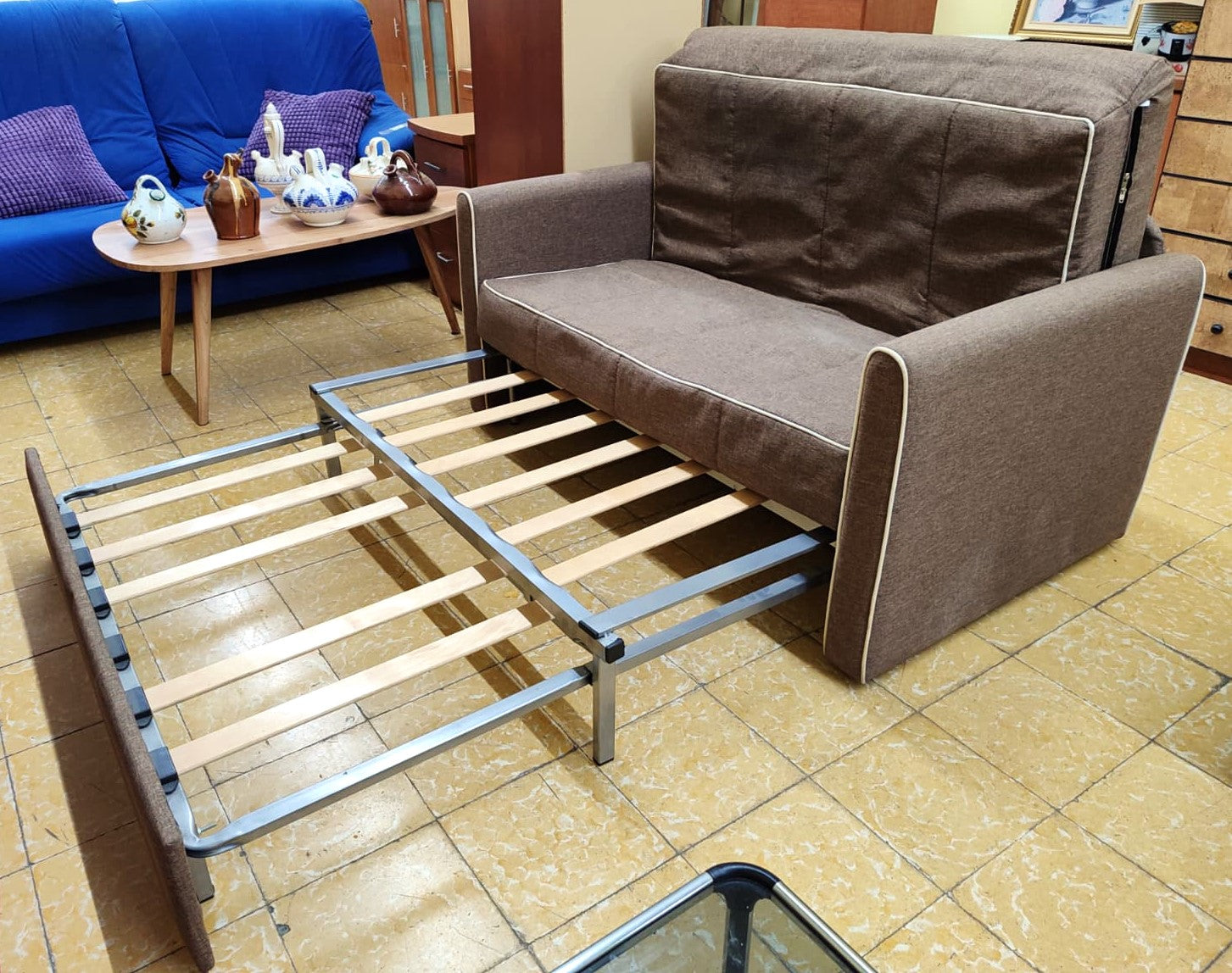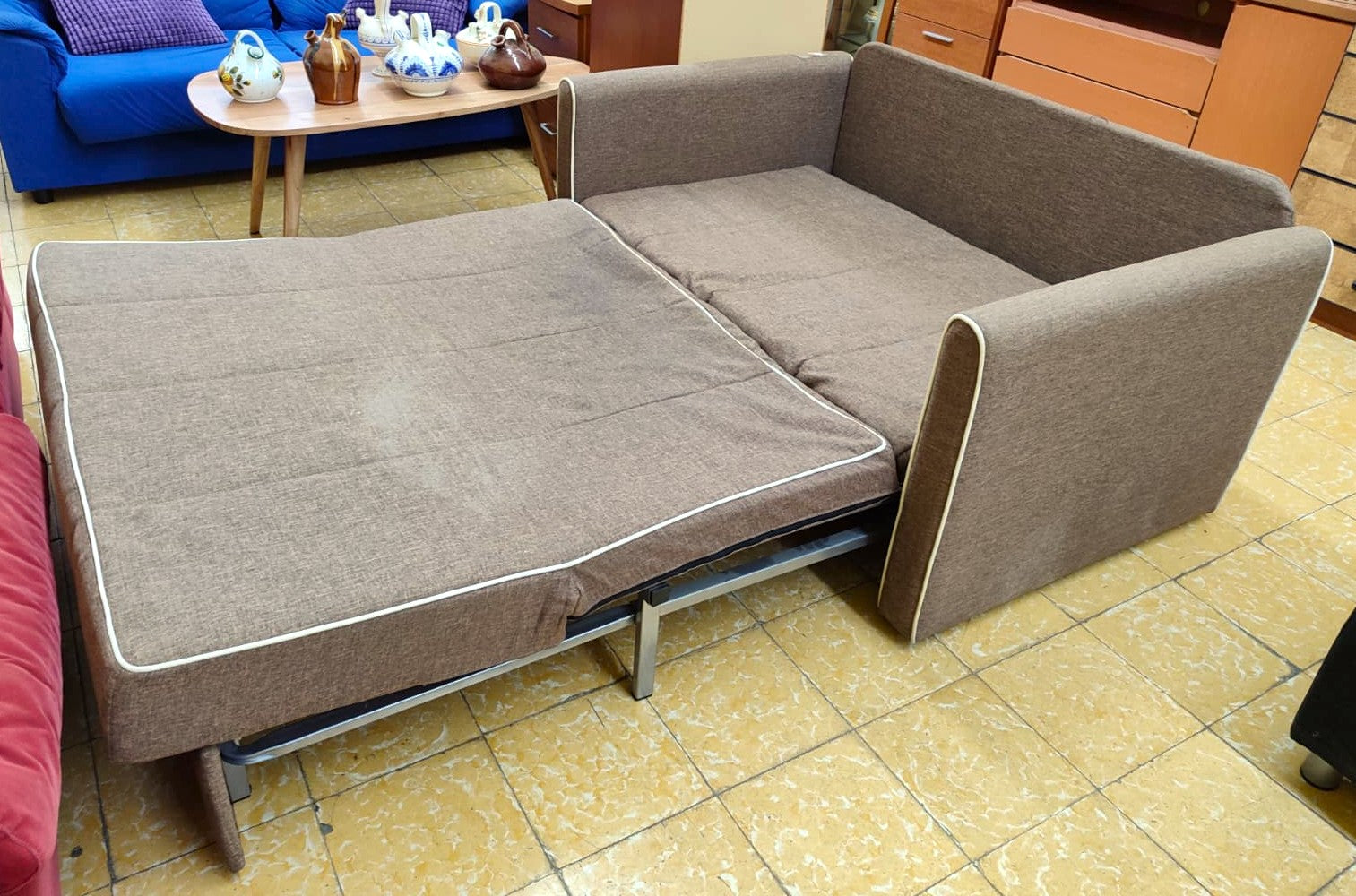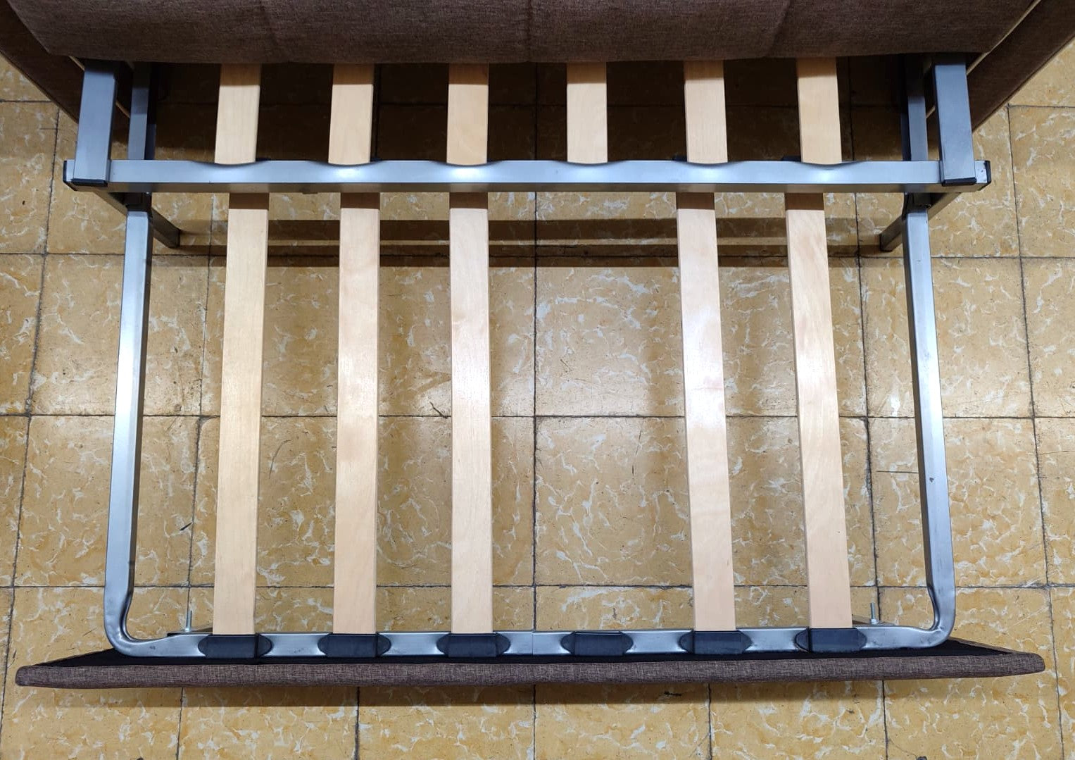 Descripción Sofá de estructura metálica y de madera. Asiento con colchoneta plegable de espuma. Funda y tapizado de tela extraíble para facilitar su limpieza. Tirando del bajo del sofá se puede hacer una cama individual de 116x182cm bastante práctica. Defectos: Al somier de la cama le falta un listón de madera. ver foto. El respaldo del sofá tiene una mancha de suciedad.