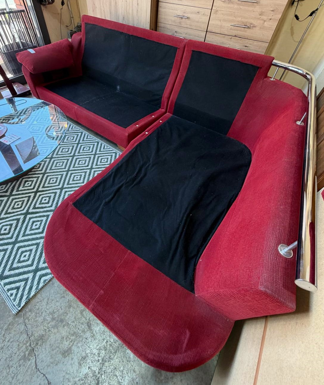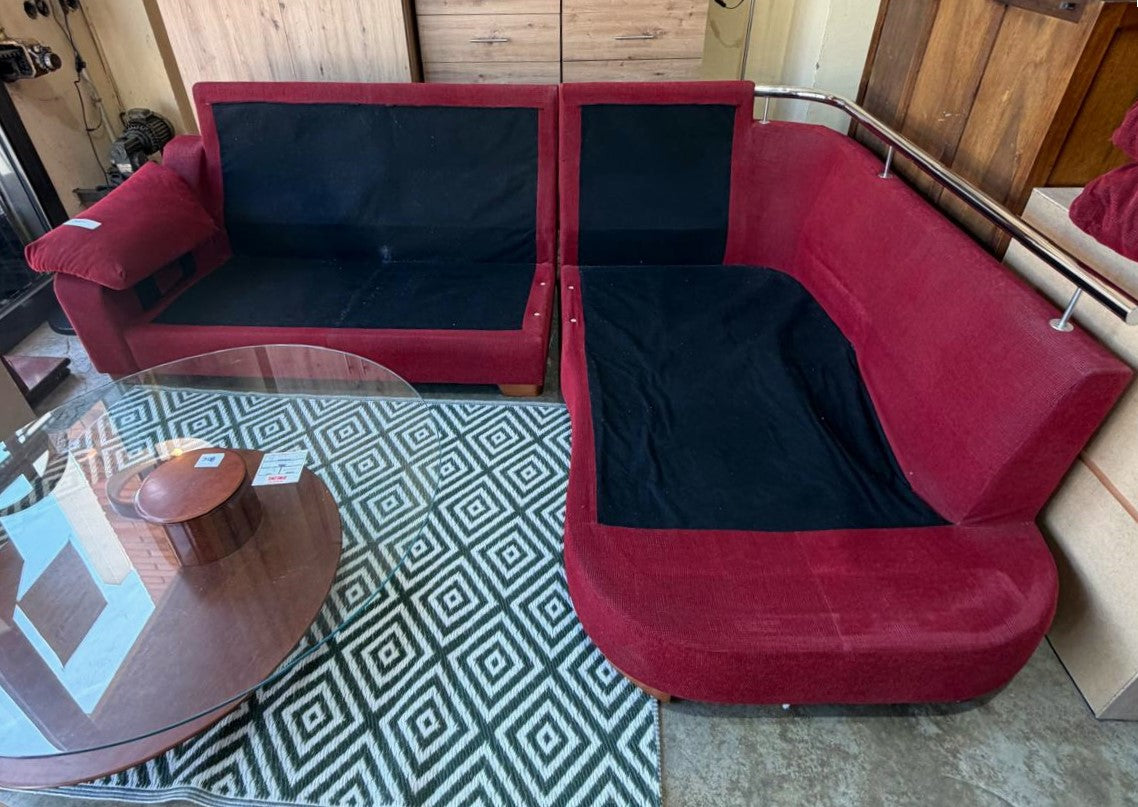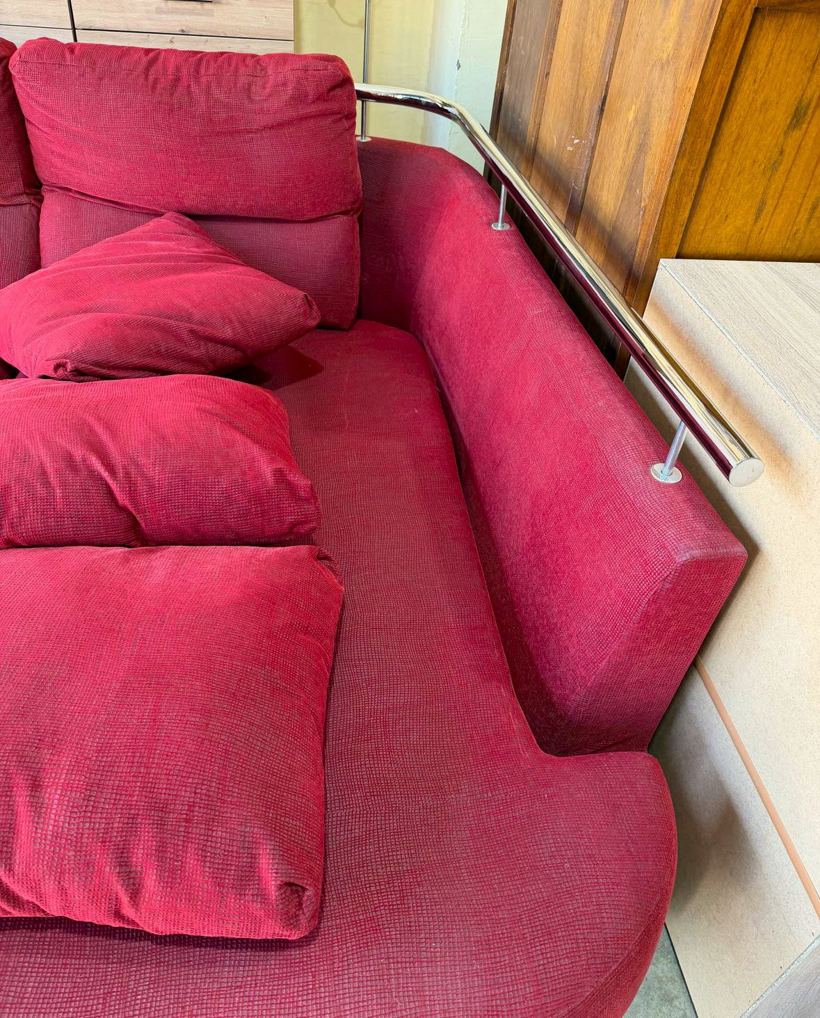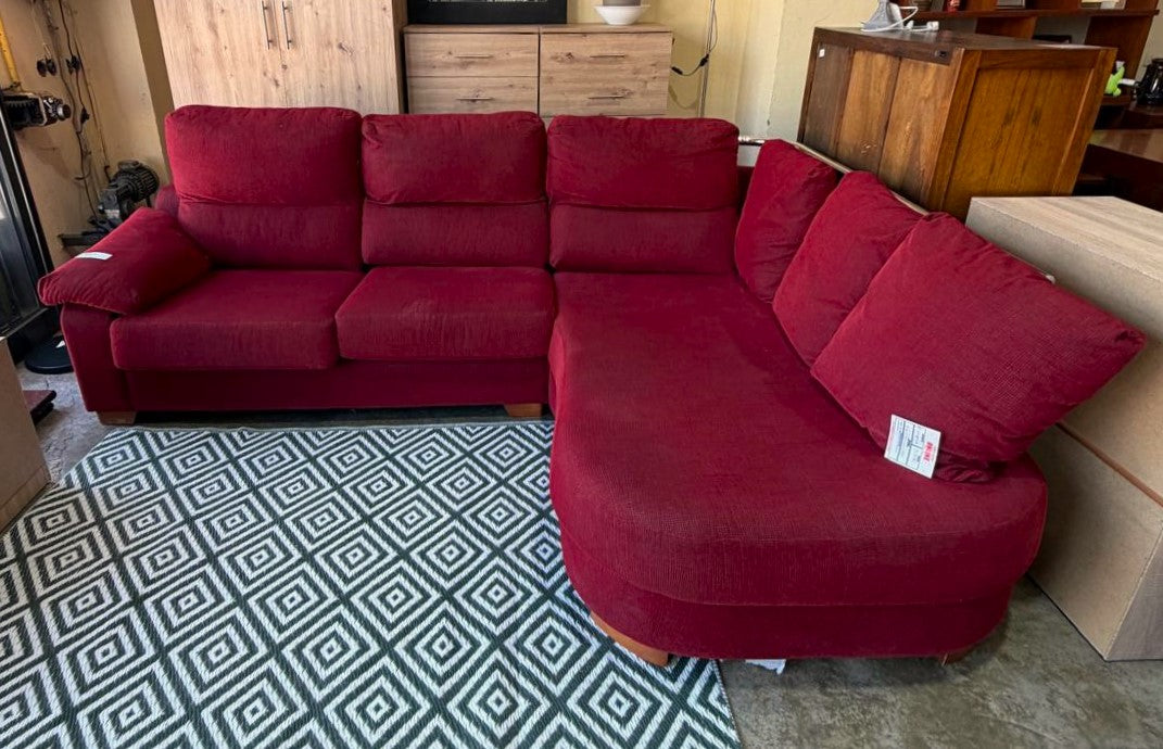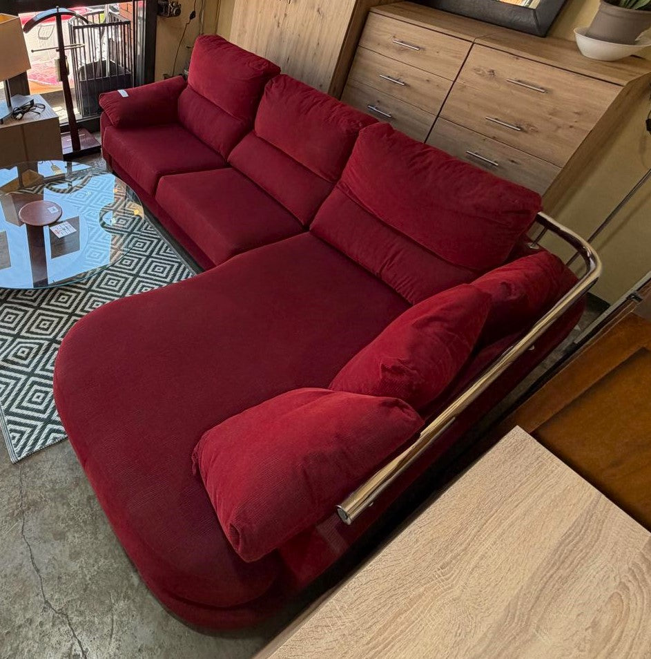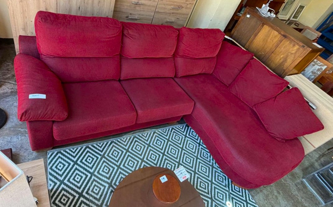 Descripción Sofá familiar amplio y muy cómodo. Sofá de respaldo alto de doble cojín con un reposabrazo acolchado. Asientos de espuma de densidad media. Chaise longue separable con respaldo y tres almohadones suaves, cuenta con una barra metálica para facilitar la reincorporación. Todos los cojines son extraíbles y desenfundables para facilitar su limpieza. Tapizado de chenilla color rojo.