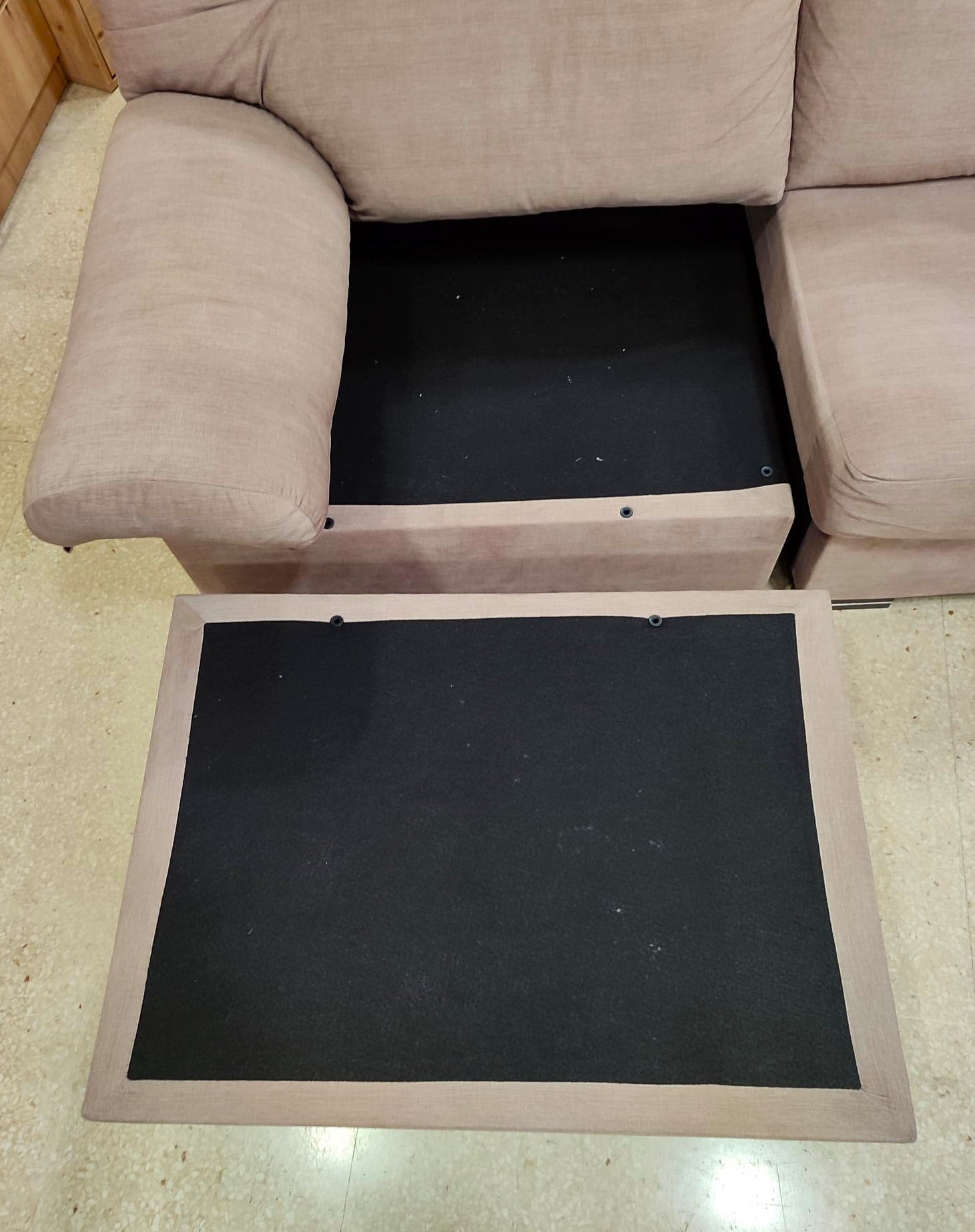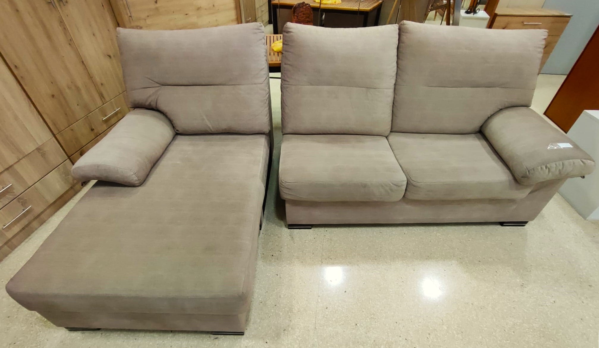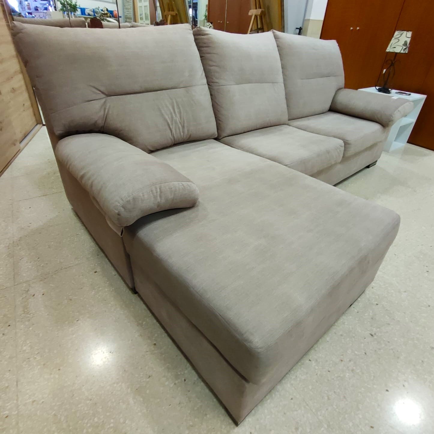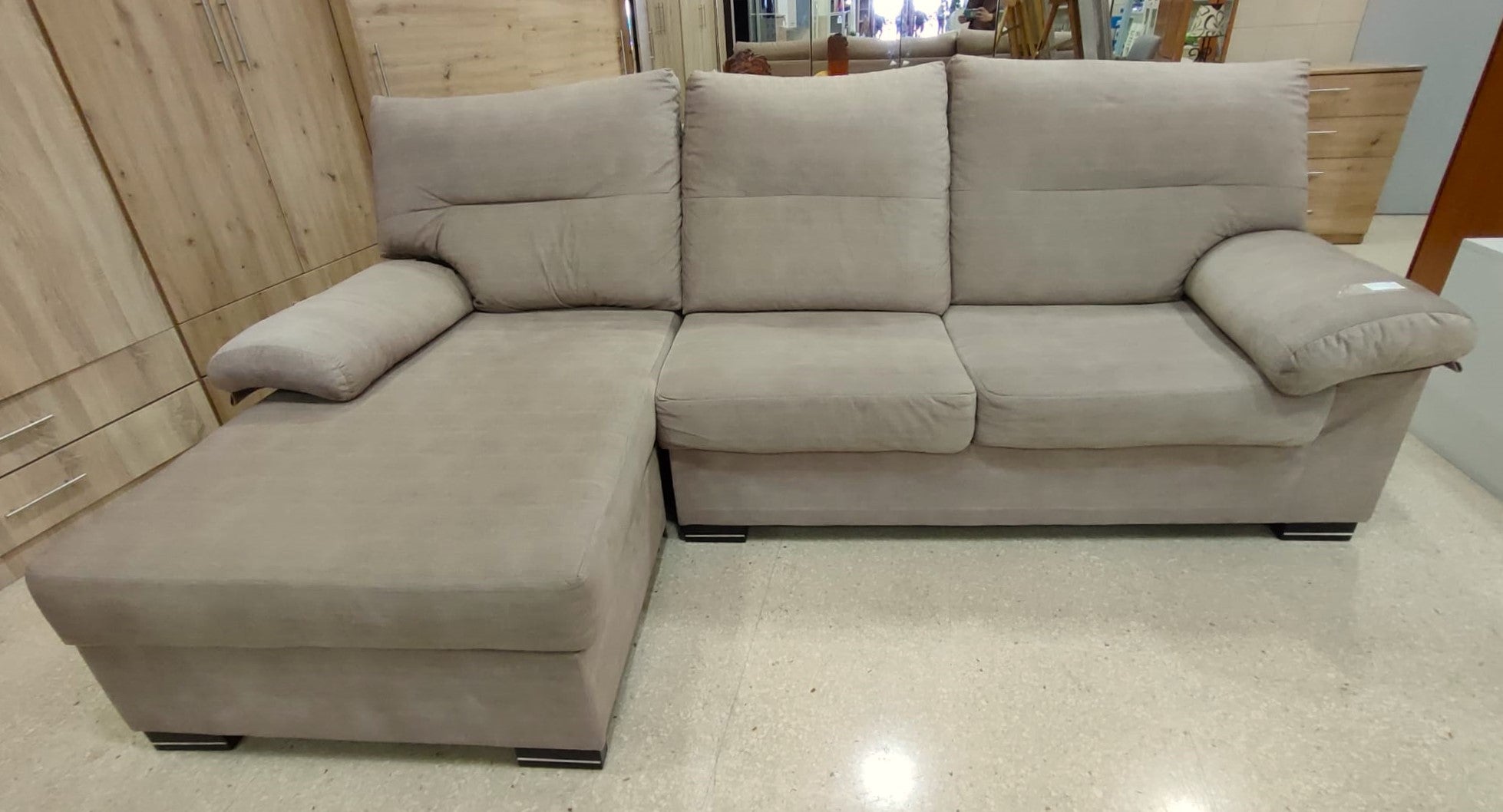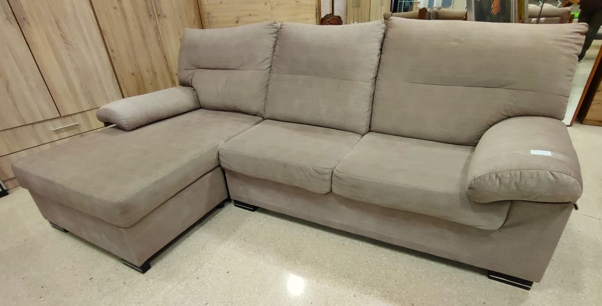 Descripción Sofá familiar, tres plazas anchas, muy cómodo. Respaldo de cojin anto acolchado y suave. Asientos de espuma de densidad media. El módulo chaise longue es separable (88x155x97 cm). Tapizado de tela color marrón.