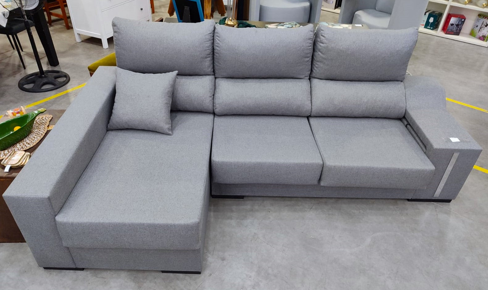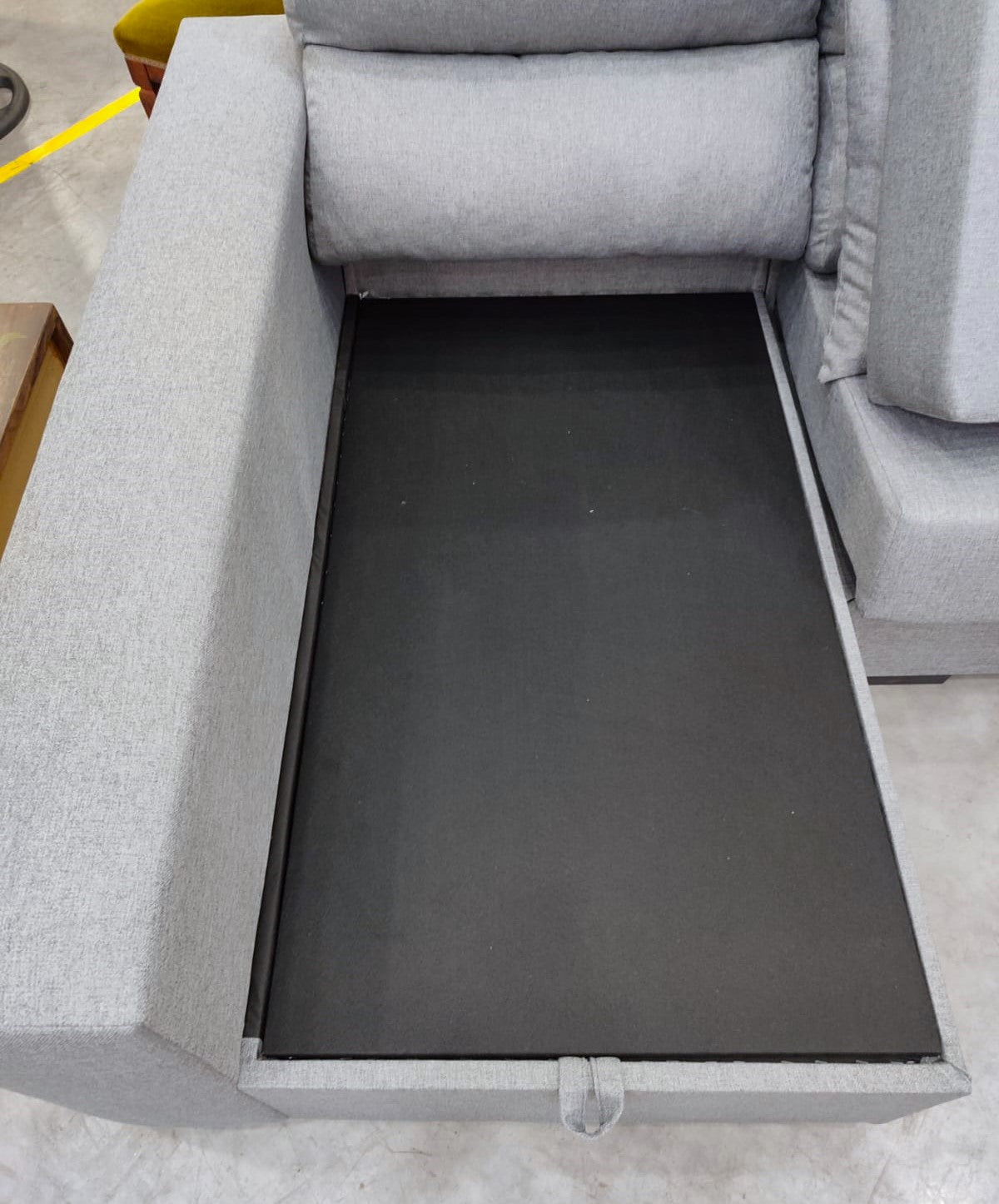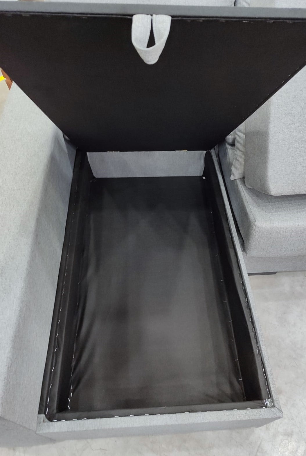 Descripción Sofá familiar de tres plazas, diseño moderno. Estructura de madera chapada. Respaldo alto de doble cojín rellenos de espuma picada. Asientos extensibles rellenos de espuma de poliuretano de alta densidad. Se pueden acompañar con dos puffs (32x29x41 cm) para tumbarse cómodamente. Chaise longue extraible con baúl de gran capacidad (60x115x20 cm). El asiento de tapa no se aguanta fijo al ser levantado. Incluye un cojín a juego. Tapizado de tela nido color gris.