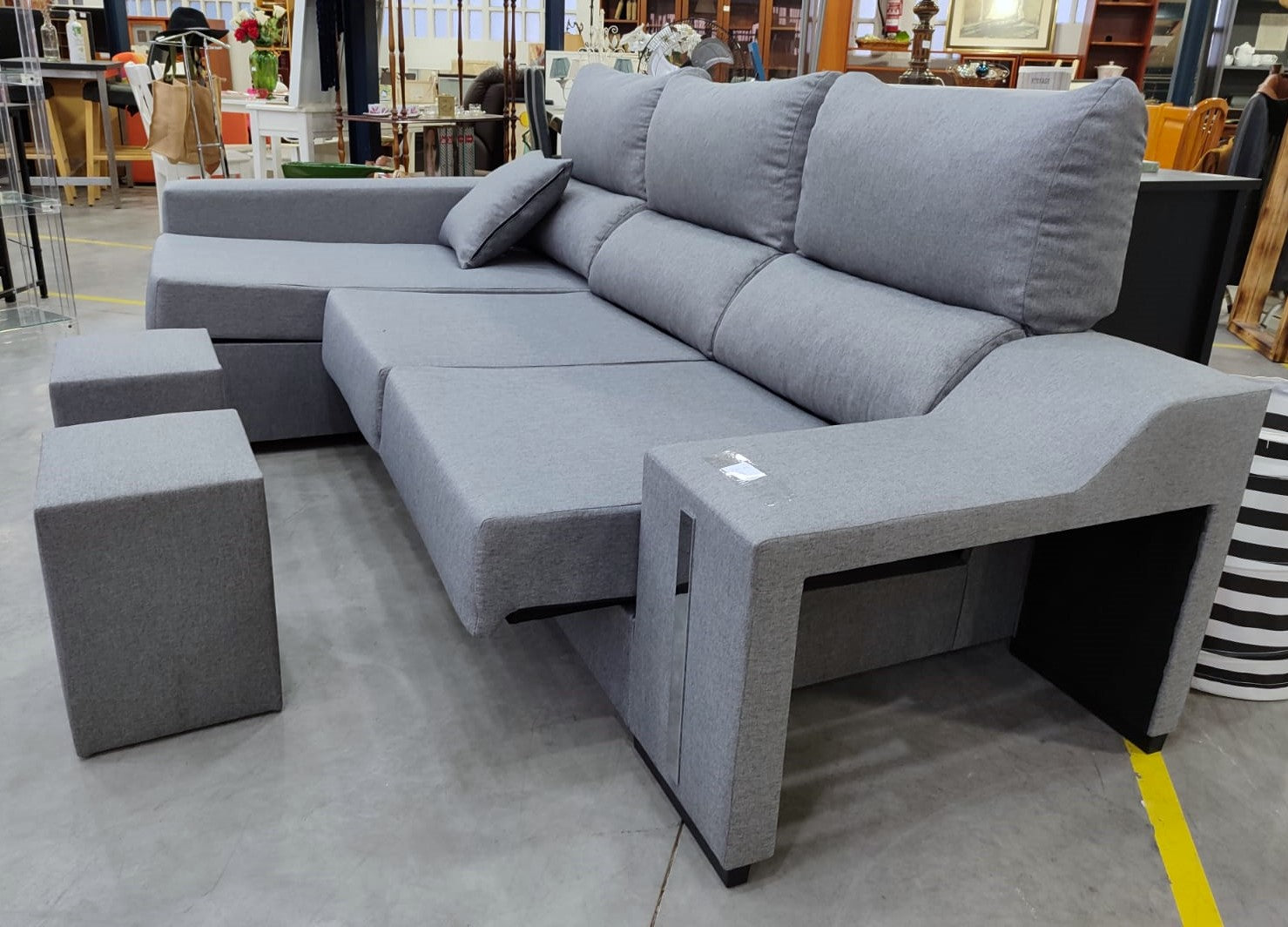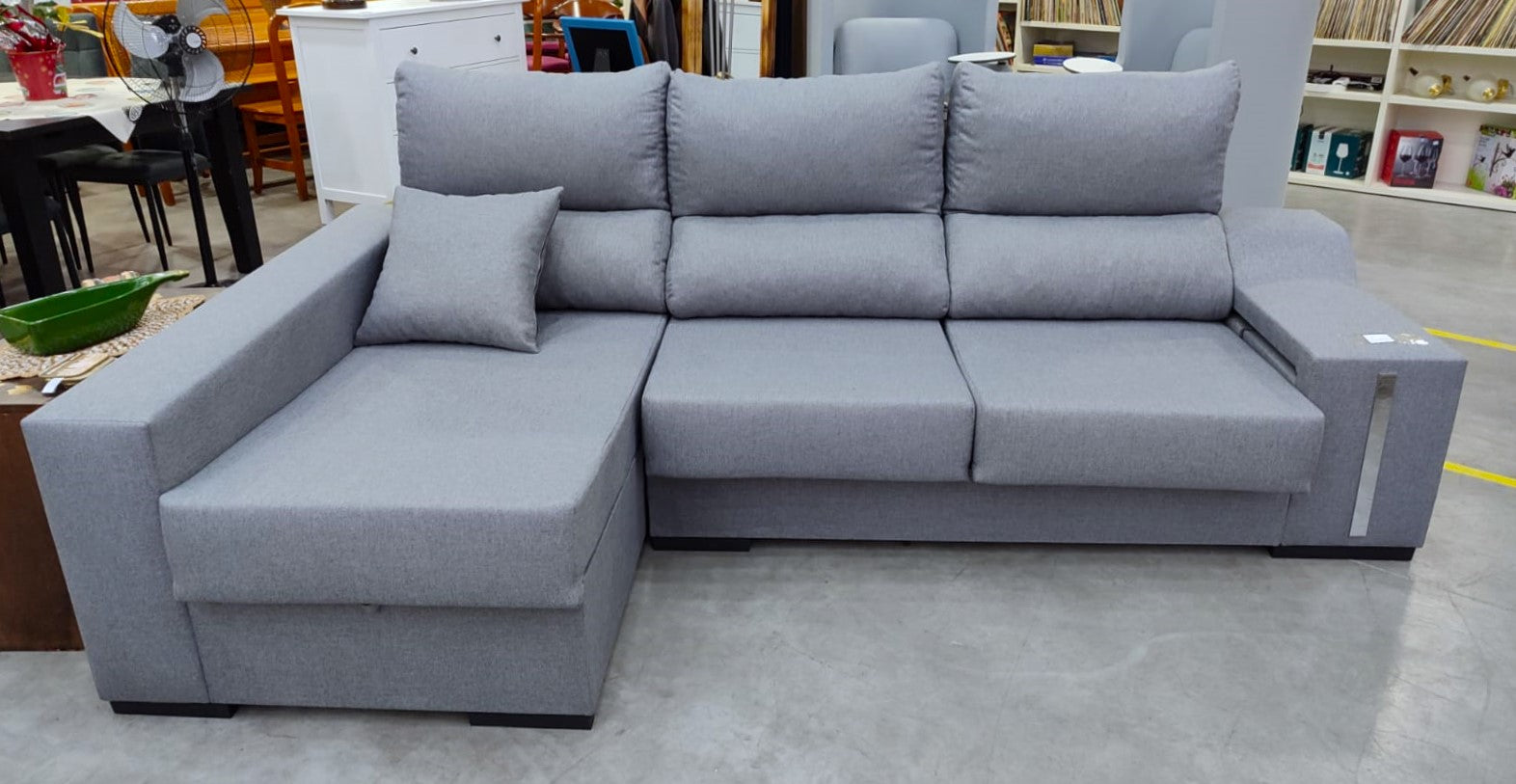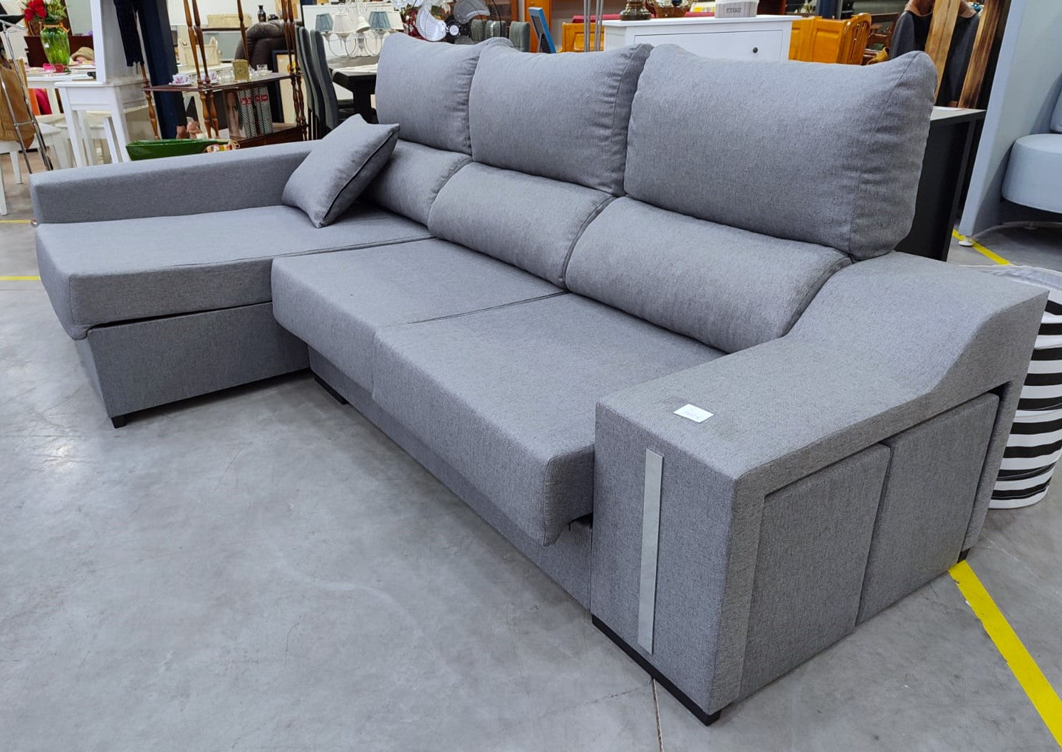 Descripción Sofá familiar de tres plazas, diseño moderno. Estructura de madera chapada. Respaldo alto de doble cojín rellenos de espuma picada. Asientos extensibles rellenos de espuma de poliuretano de alta densidad. Se pueden acompañar con dos puffs (32x29x41 cm) para tumbarse cómodamente. Chaise longue extraible con baúl de gran capacidad (60x115x20 cm). El asiento de tapa no se aguanta fijo al ser levantado. Incluye un cojín a juego. Tapizado de tela nido color gris.