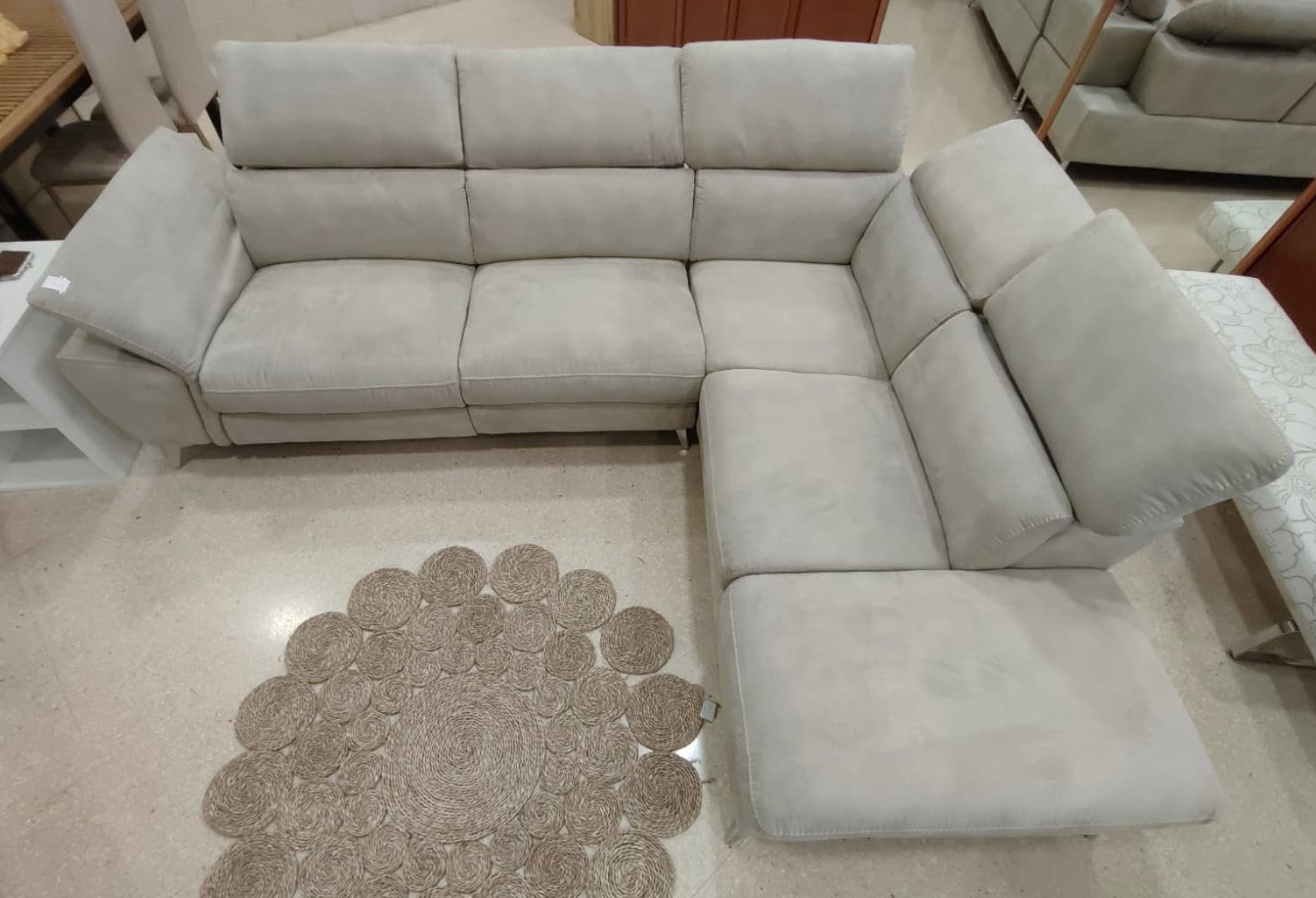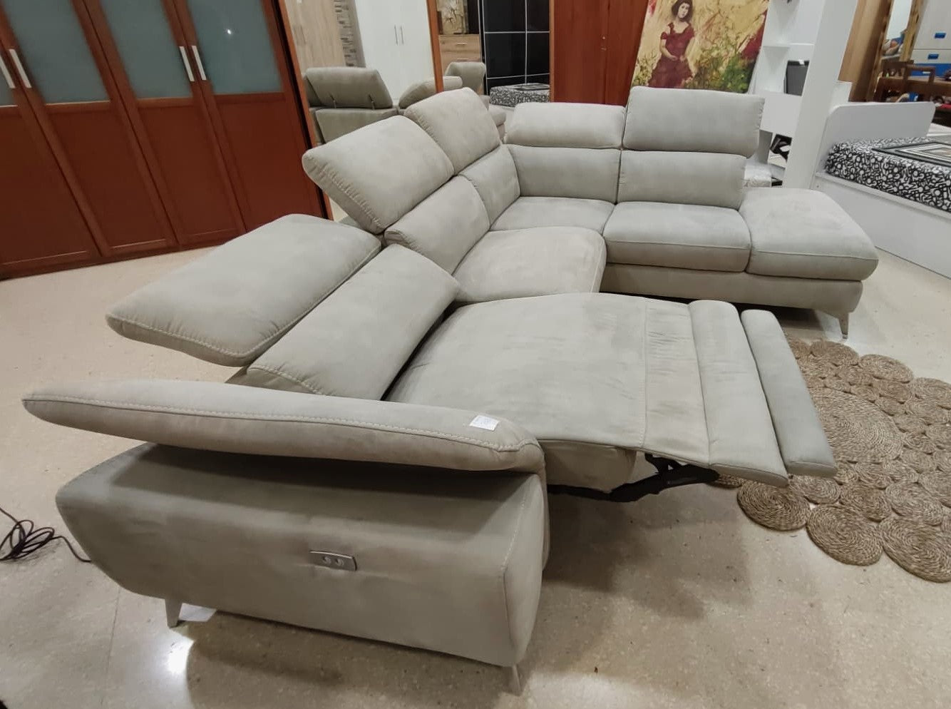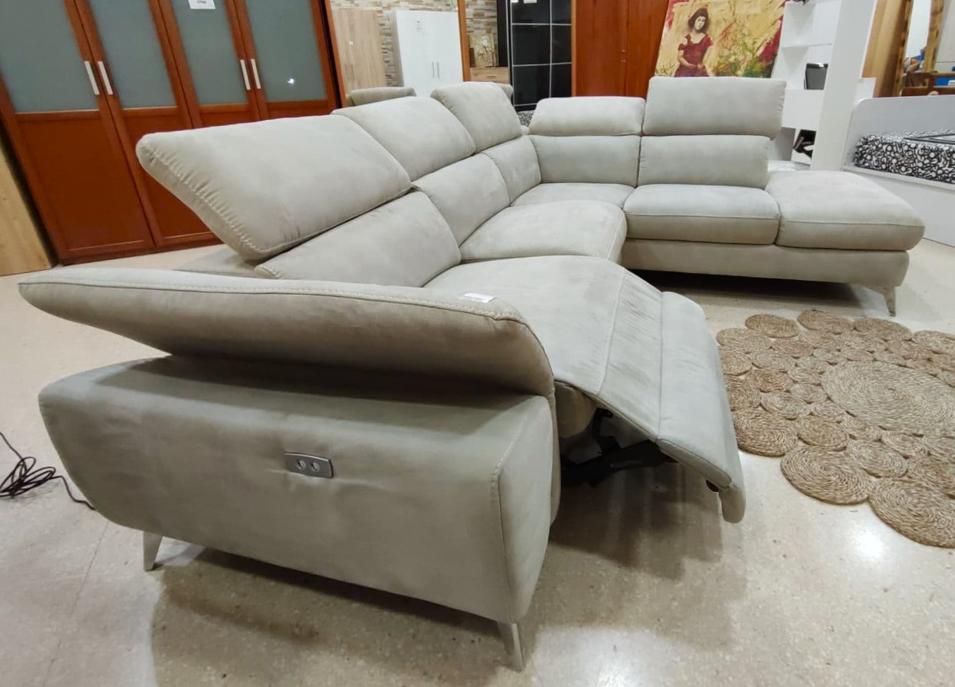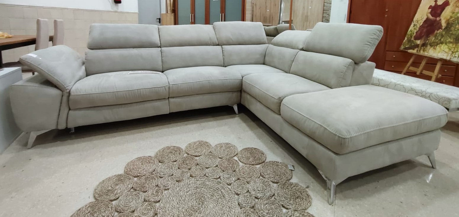 Descripción Amplio sofá chaise longue con reposacabezas ajustables. Estructura de madera maciza con soportes reforzados. Respaldo y reposabrazos de espuma de poliuretano de densidad media de 24 kg/m3. Módulo chaise longue separable (solo lado derecho), dispone de un amplio baúl multiusos. Un asiento reclinable eléctrico para máxima comodidad, botones de mando en el lateral. (Resistencia máxima: 120 kg). Tapizado de alta calidad con tela magnolia de textura suave y resistente. Limpiar en seco.