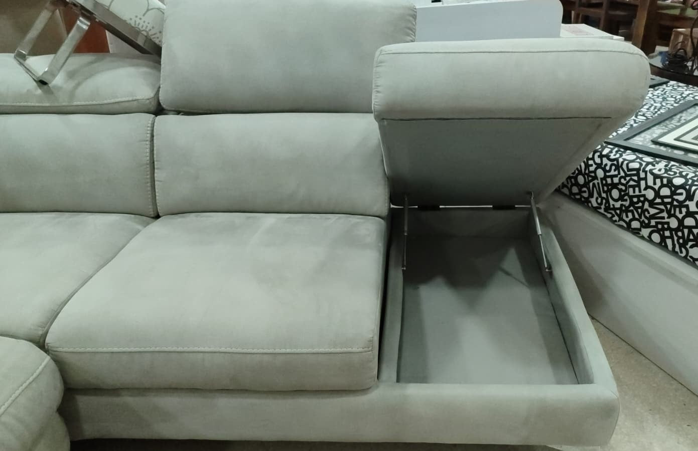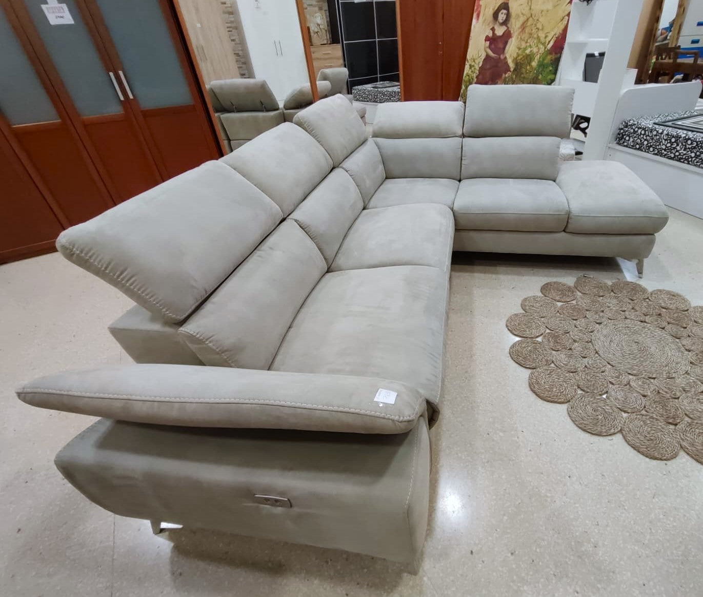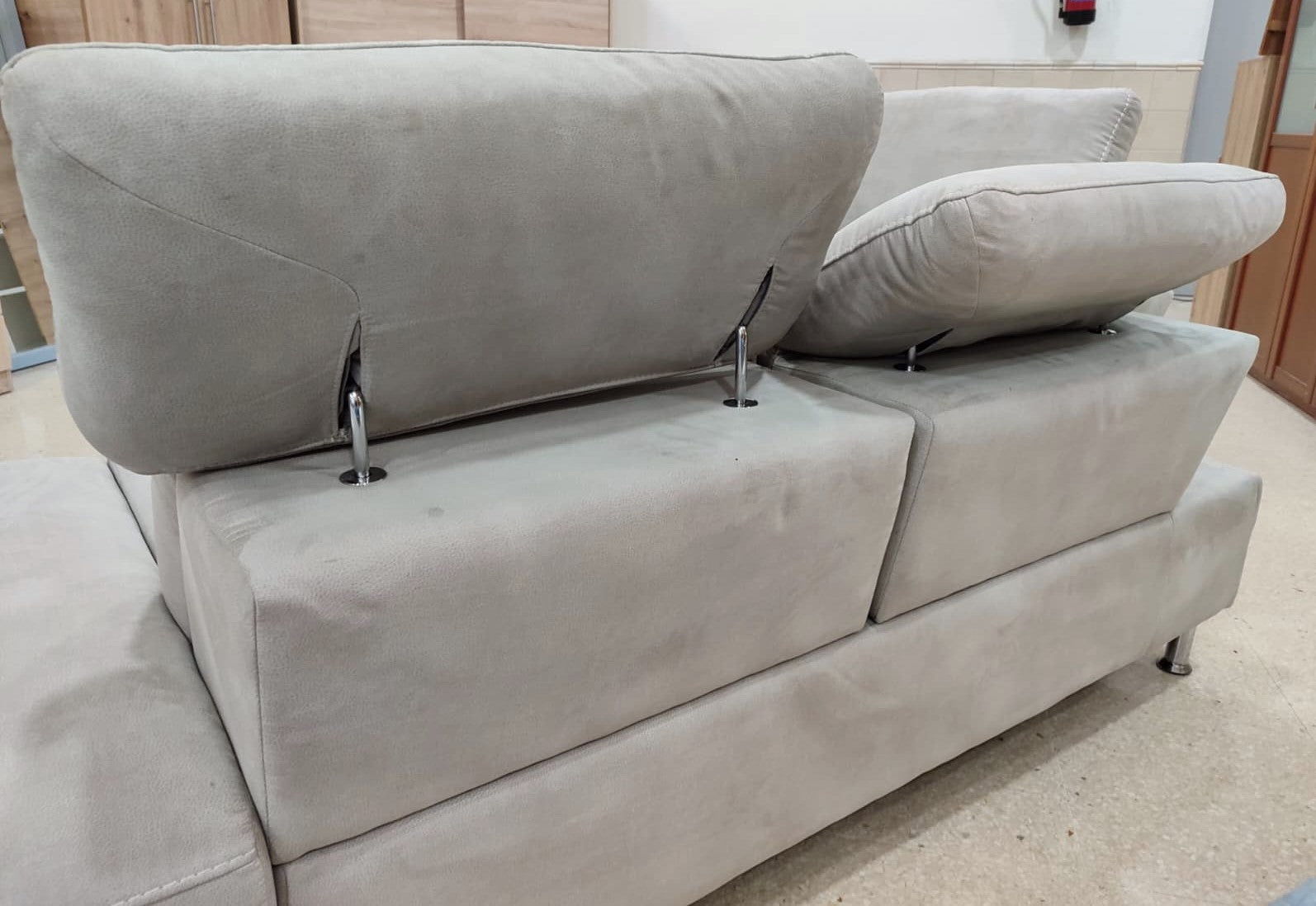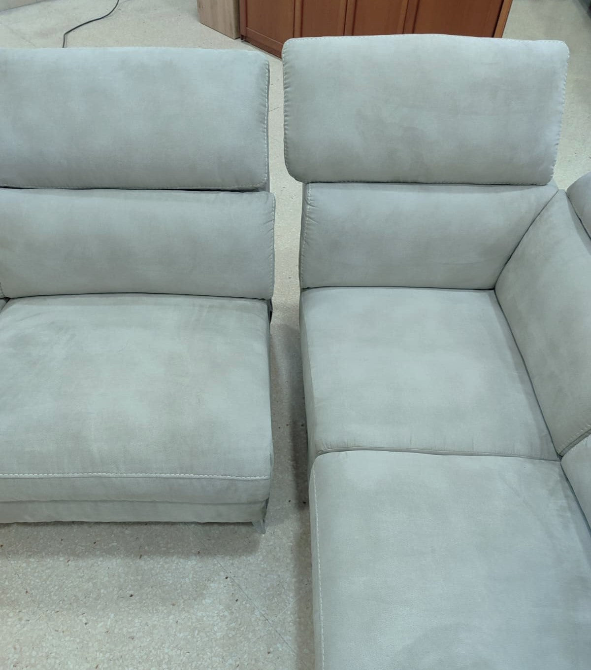 Descripción Amplio sofá chaise longue con reposacabezas ajustables. Estructura de madera maciza con soportes reforzados. Respaldo y reposabrazos de espuma de poliuretano de densidad media de 24 kg/m3. Módulo chaise longue separable (solo lado derecho), dispone de un amplio baúl multiusos. Un asiento reclinable eléctrico para máxima comodidad, botones de mando en el lateral. (Resistencia máxima: 120 kg). Tapizado de alta calidad con tela magnolia de textura suave y resistente. Limpiar en seco.