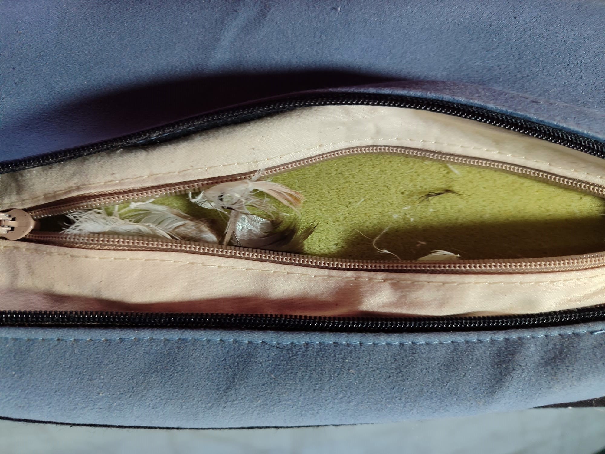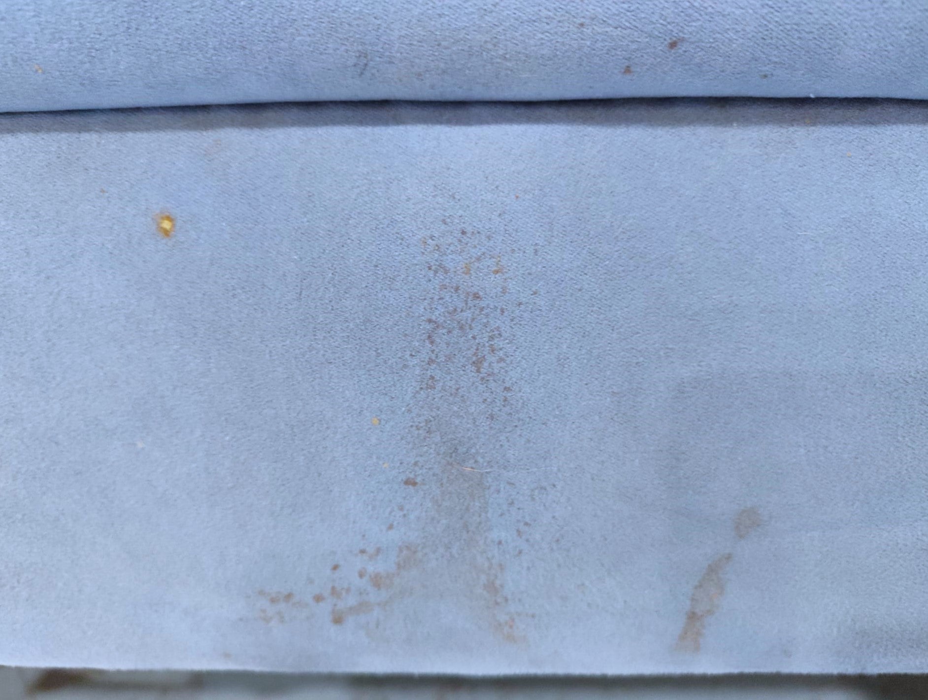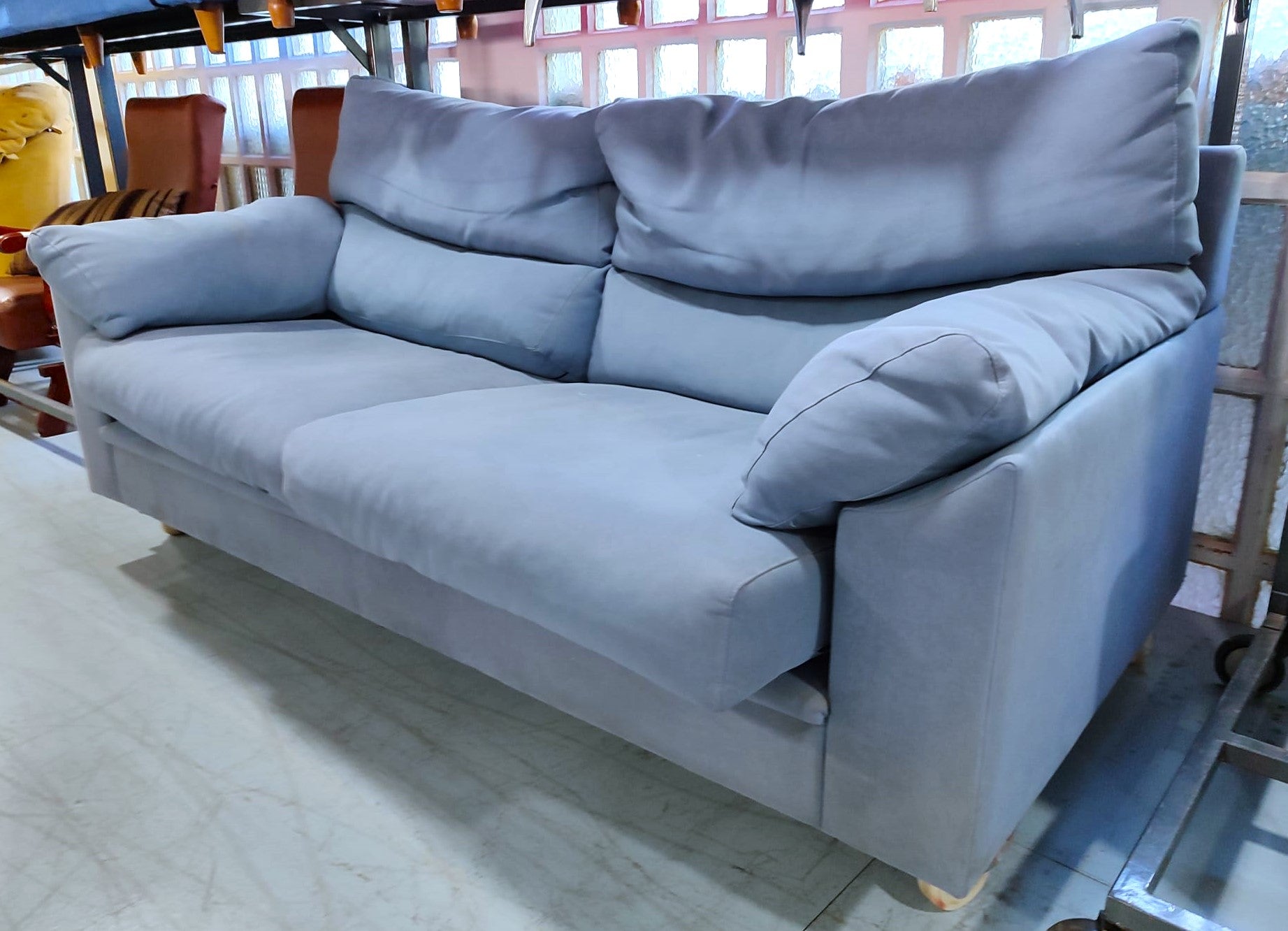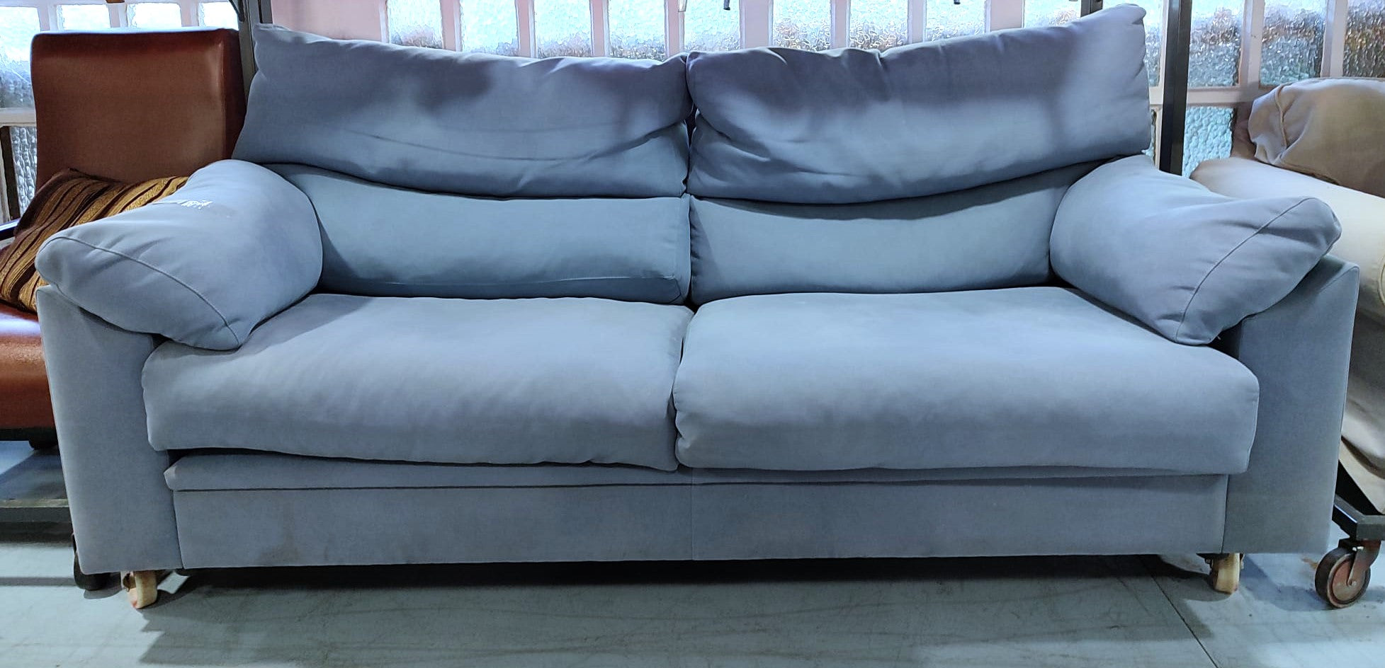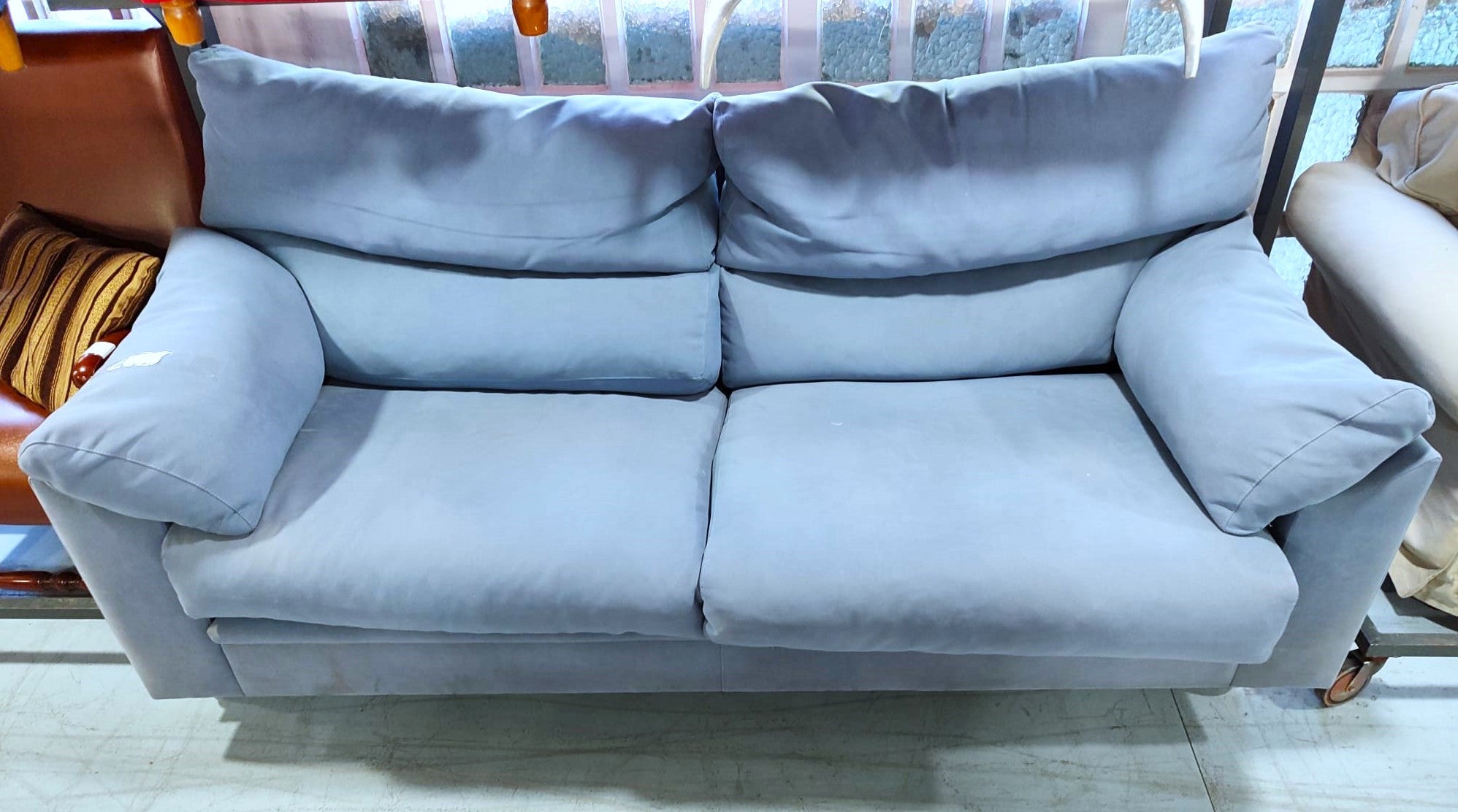 Descripción Amplio sofá biplaza, muy suave y cómodo. Respaldo alto y mullido de doble cojín con reposabrazos acolchados. Asientos de espuma de densidad media. Todos los cojines están rellenos de una capa de plumas que le dan más suavidad. Todos los cojines son desenfundables para garantizar una mejor higiene. Tapizado de tela azul suave al tacto. Defecto: El tapizado tiene algunas manchas, principalmente, en la parte baja de la estructura.