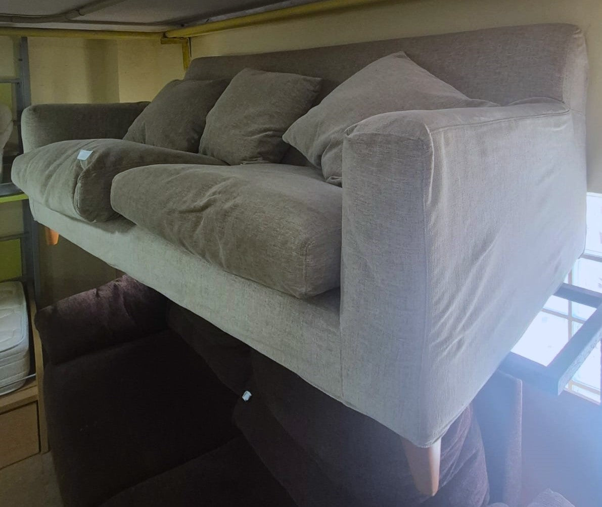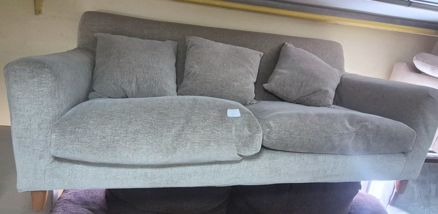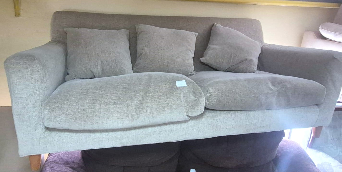 Descripción Sofá espacioso, muy cómodo. Respaldo alto con reposabrazos. Asientos de cojín rellenos de espuma de firmeza media. Incluye tres pequeños cojines a juego. Tapizados de chenilla color gris. Desenfundables.