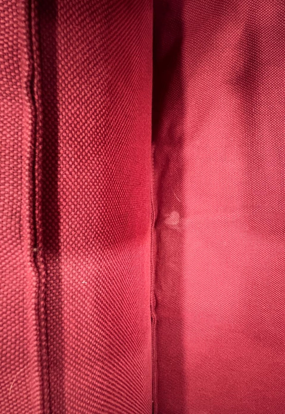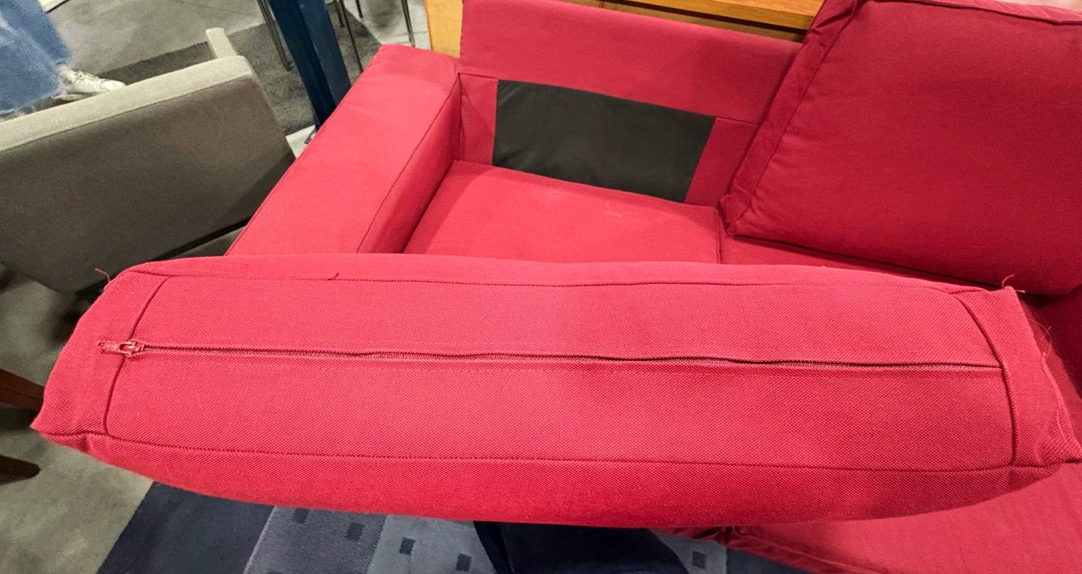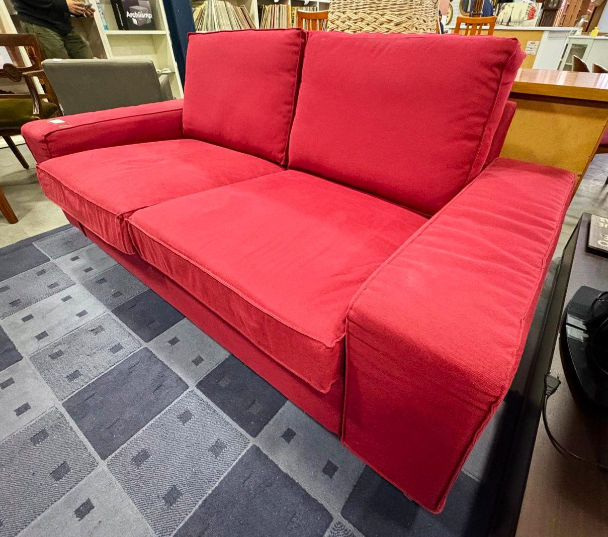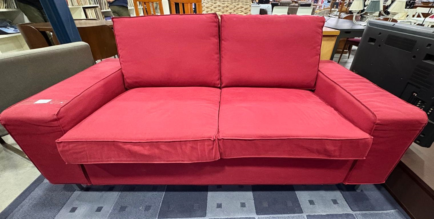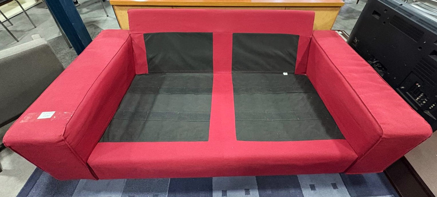 Descripción Sofá de plazas amplias. Respaldo con cojines altos muy cómodos. Asiento con cojines de espuma y reposabrazos cuadrados, anchos. Tapizado de tejido resistente, color rojo. Todos los cojines son extraíbles y desenfundables para facilitar su limpieza. Defecto: Tiene alguna pequeñas manchas de algo como aceite.