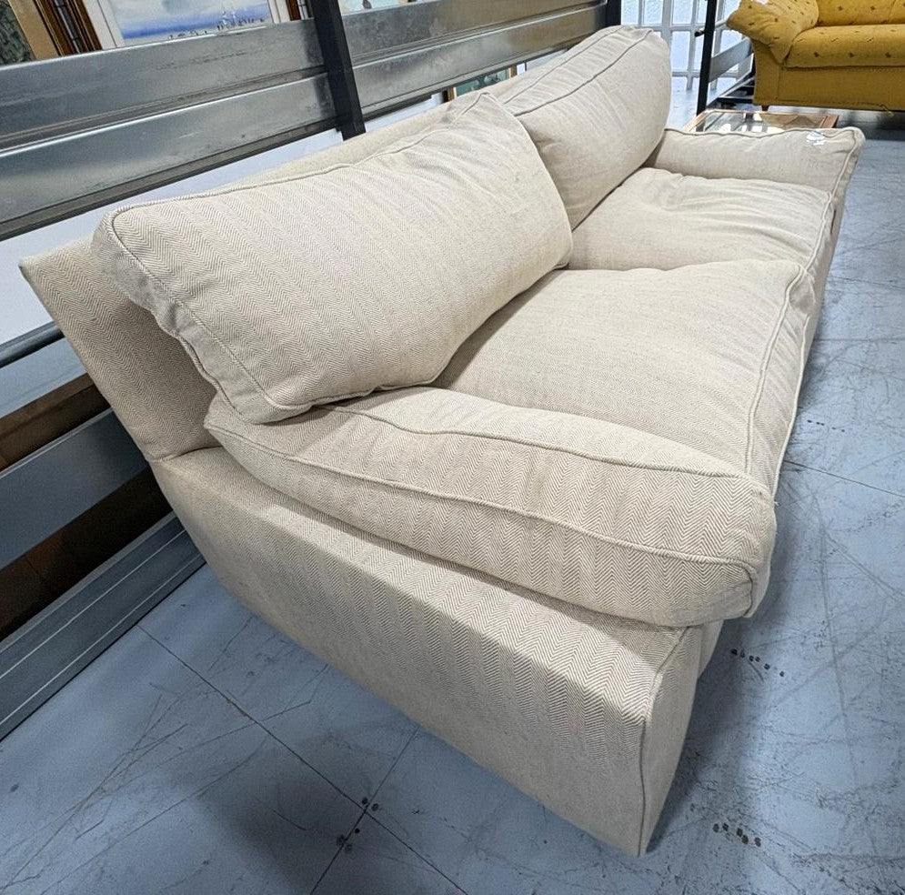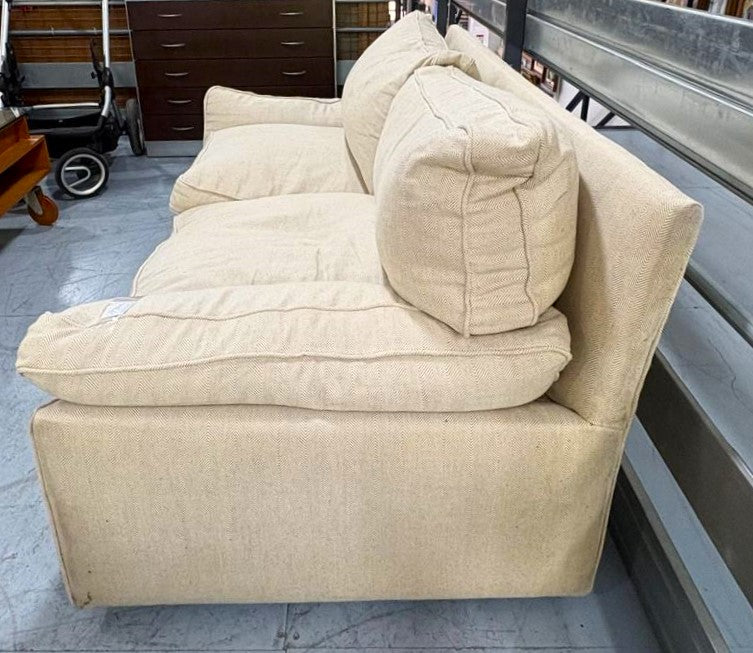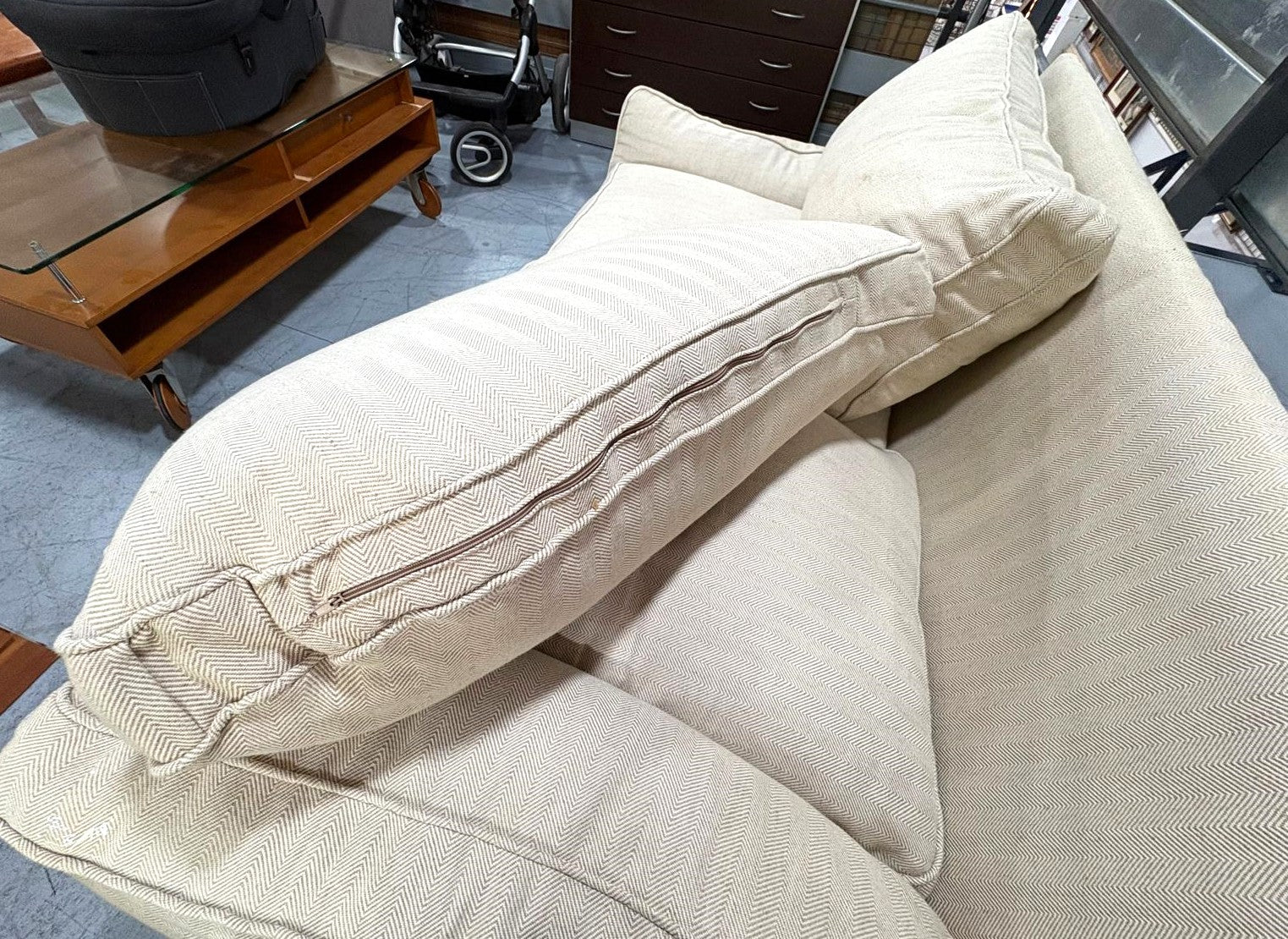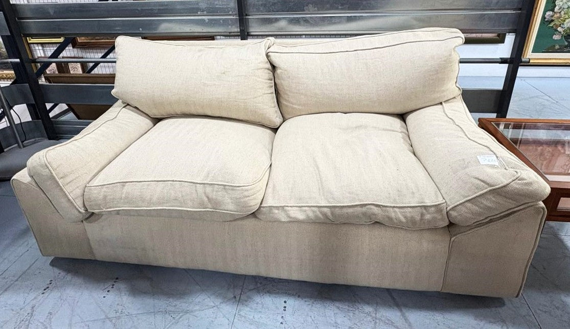 Descripción Sofá biplaza muy cómodo y acogedor. Todos los cojines tanto del respaldo, como del asiento y reposabrazos son extraíbles y desenfundables para facilitar su limpieza. Relleno de plumas que le da un confort especial haciéndolo más acogedor. Tapizado de tejido resistente. Defecto: Tiene algunas pequeñas manchas y alguna rotura menor.