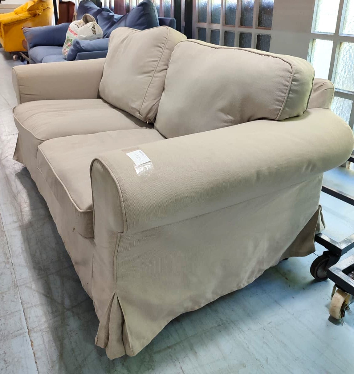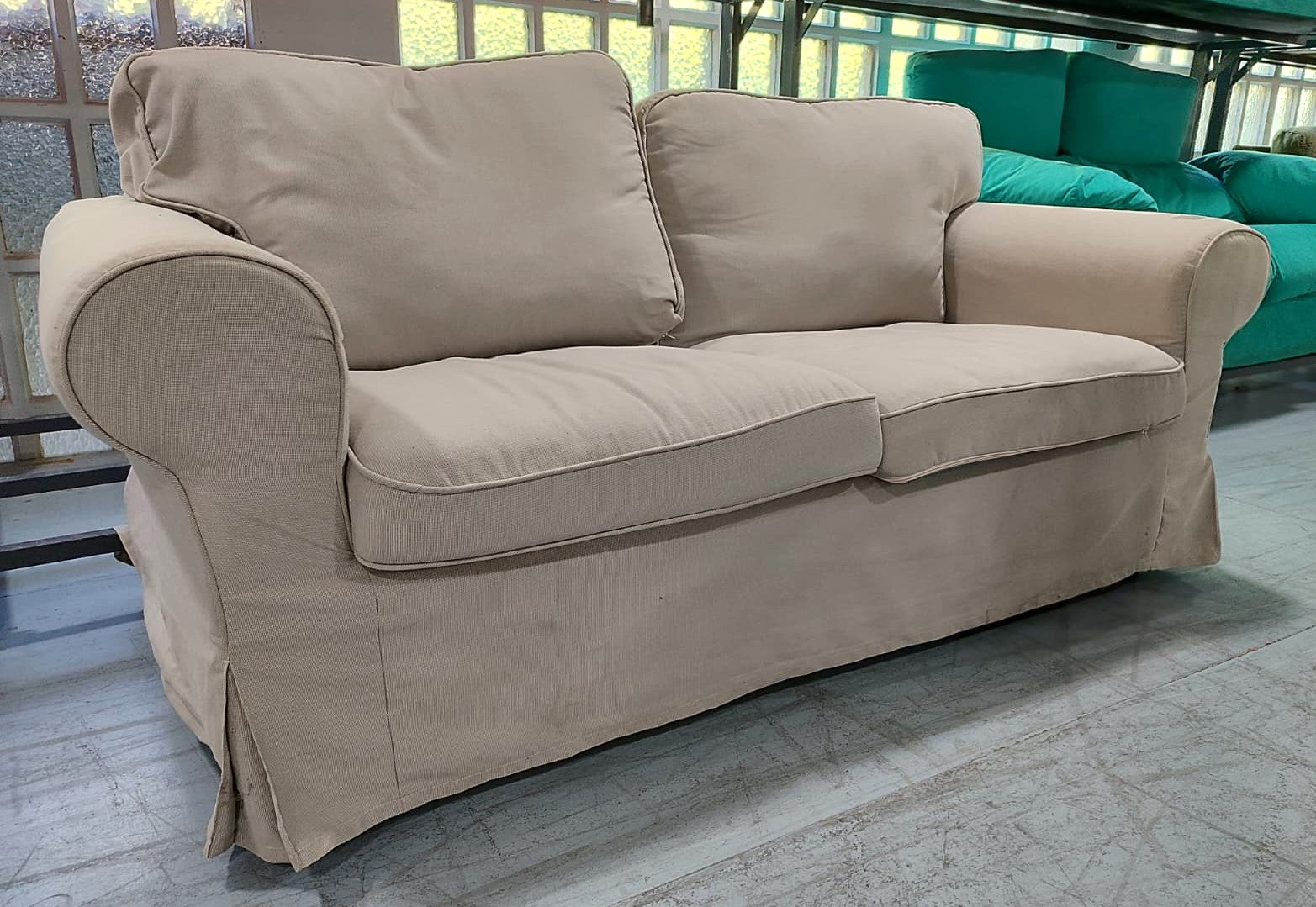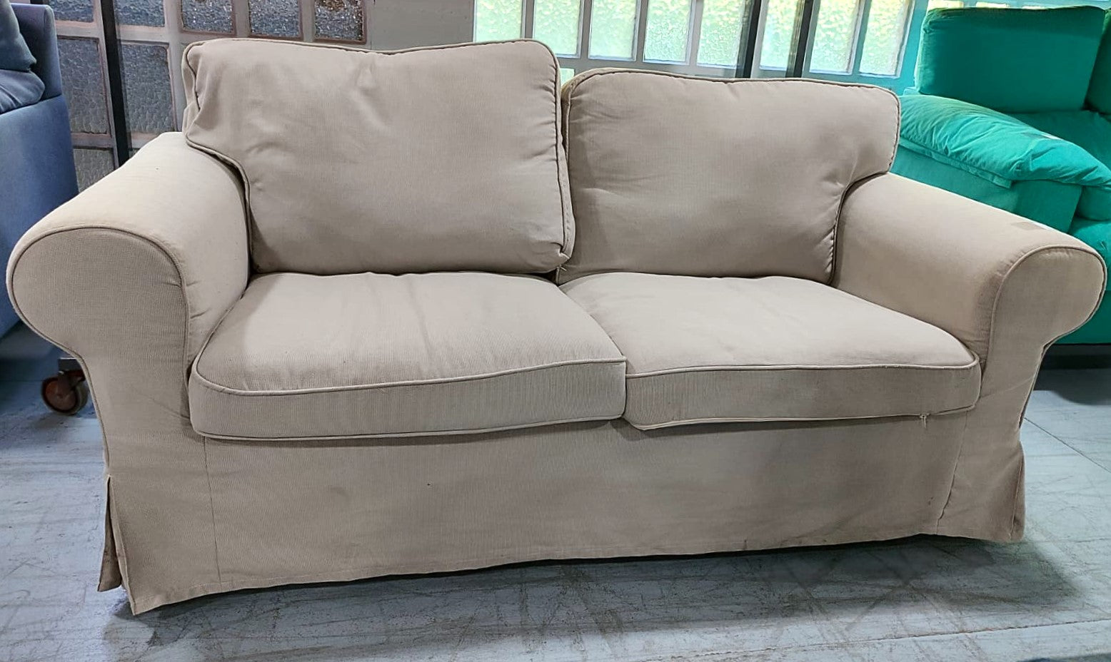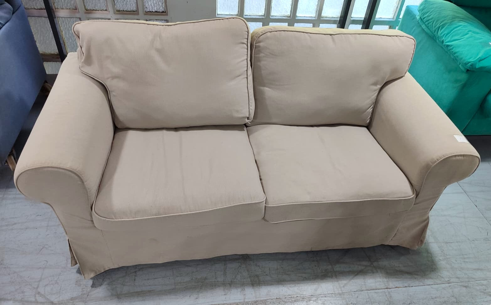 Descripción Cómodo sofá de dos plazas. Respaldo alto. Asientos de cojines extraíbles, reposabrazos altos y redondos. Funda de tela color beige.