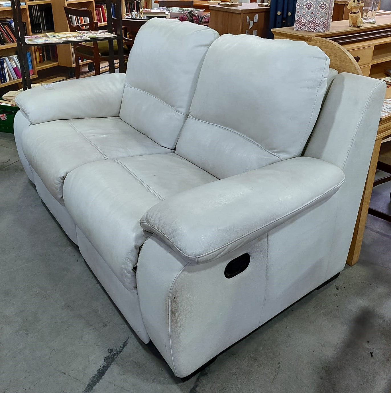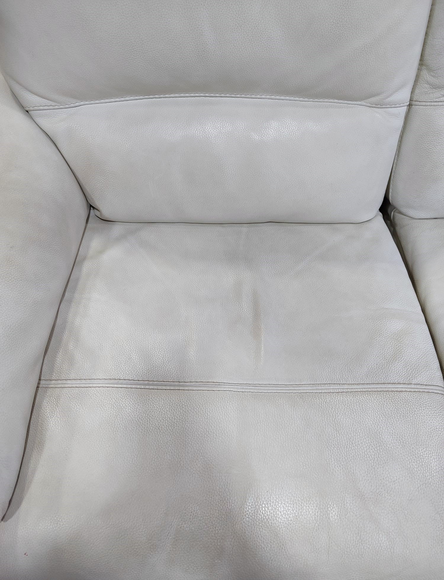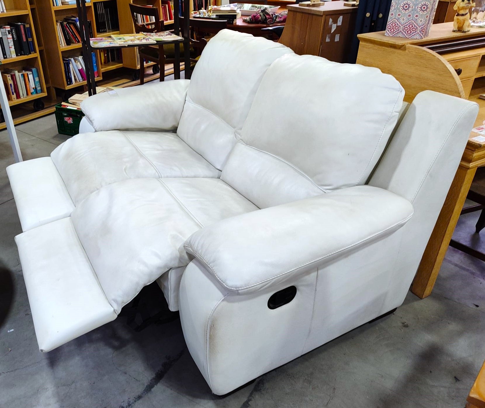 Descripción Sofá de dos plazas anchas, y bastidor metálico. Respaldo alto de doble cojín muy acolchado. Reclinable. Reposabrazos de almohadón acolchado. Asientos de espuma con reposapiés extensible. Separable en dos módulos independientes (80cm cada uno).Sis tema de extensión de fácil uso, tirando de la palanca que tiene el asiento en el lateral. Tapizado cosido de polipiel color blanco. Defecto: El tapizado presenta manchas y desgaste por el uso. Ver fotos.