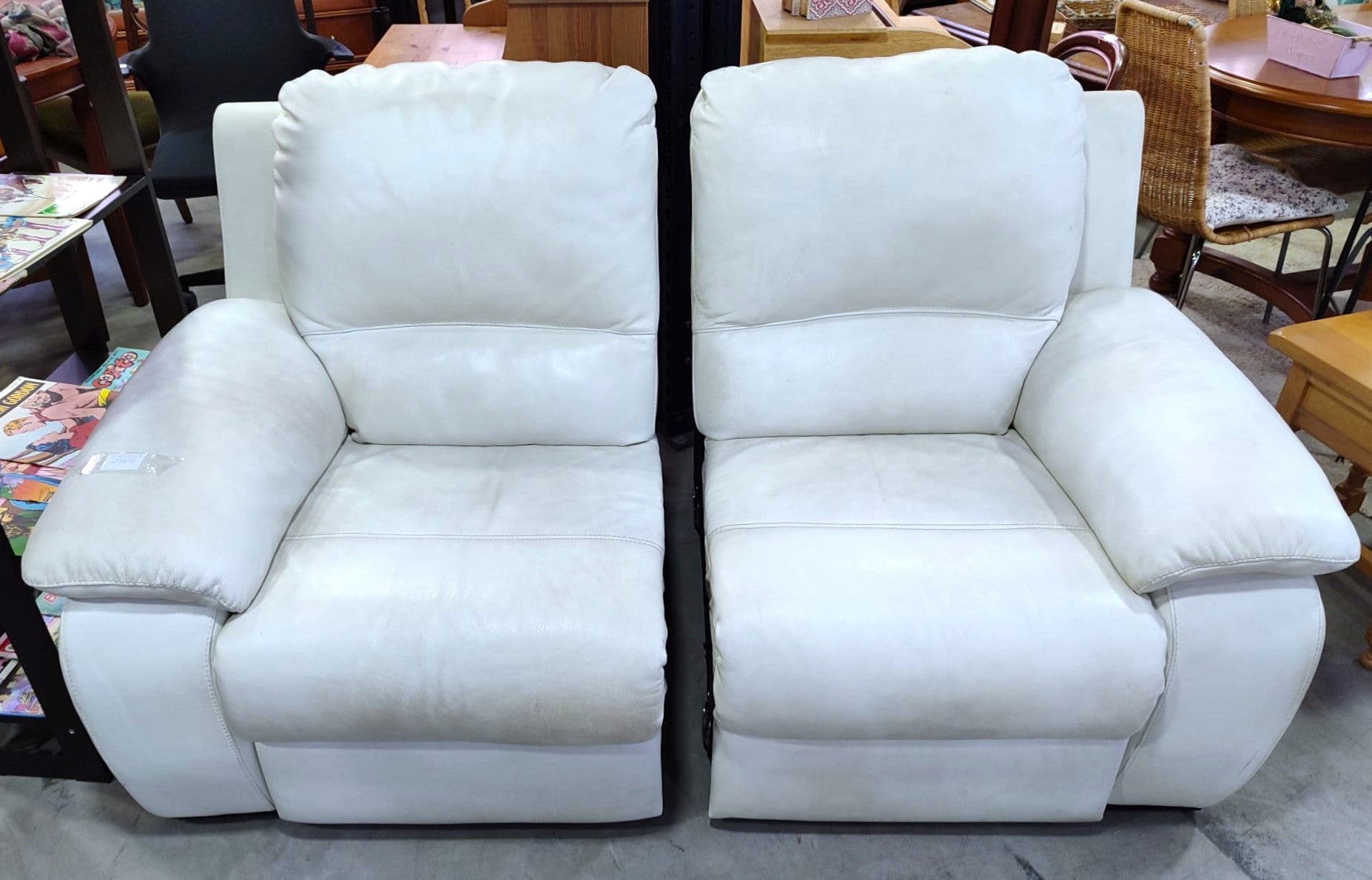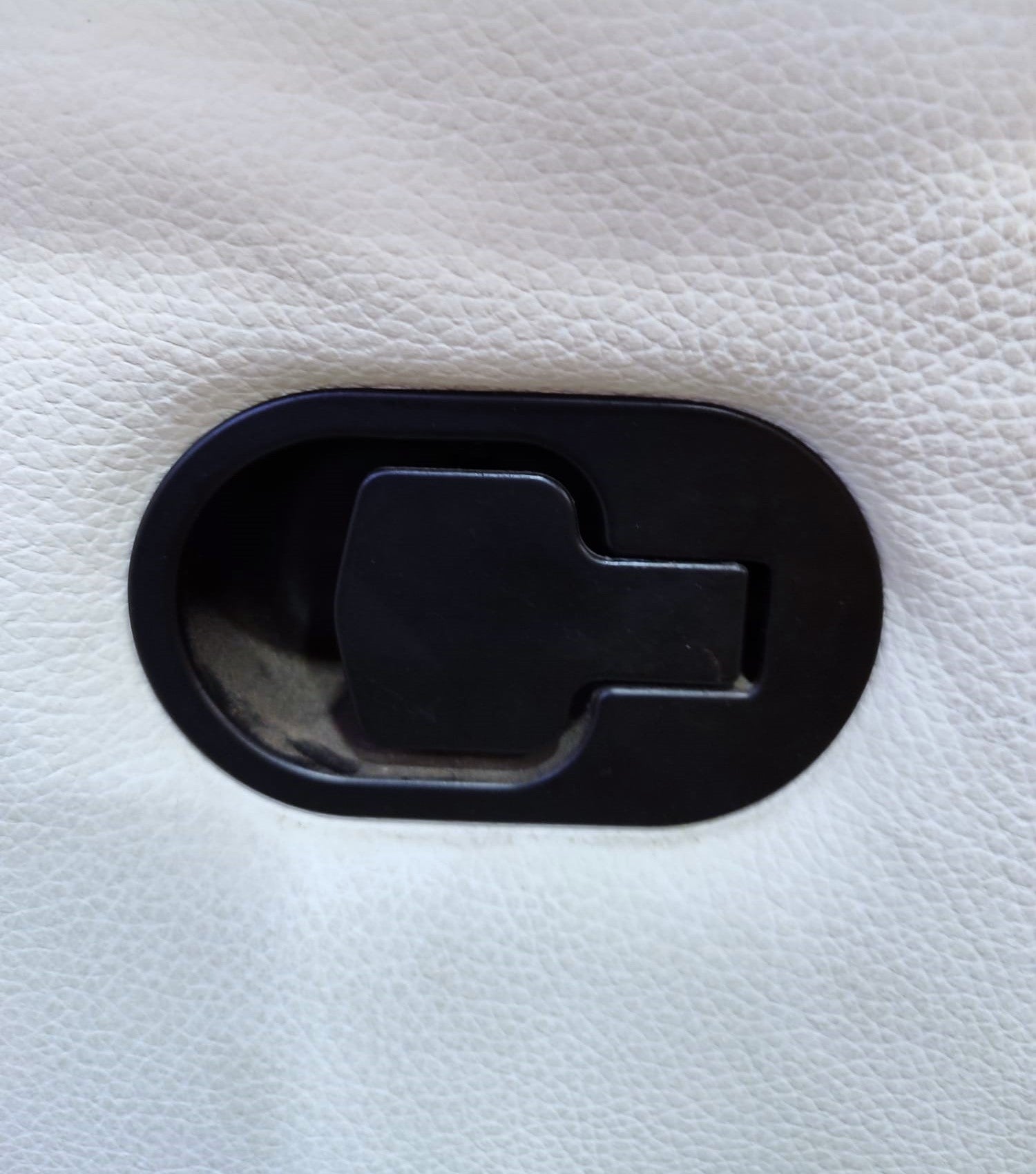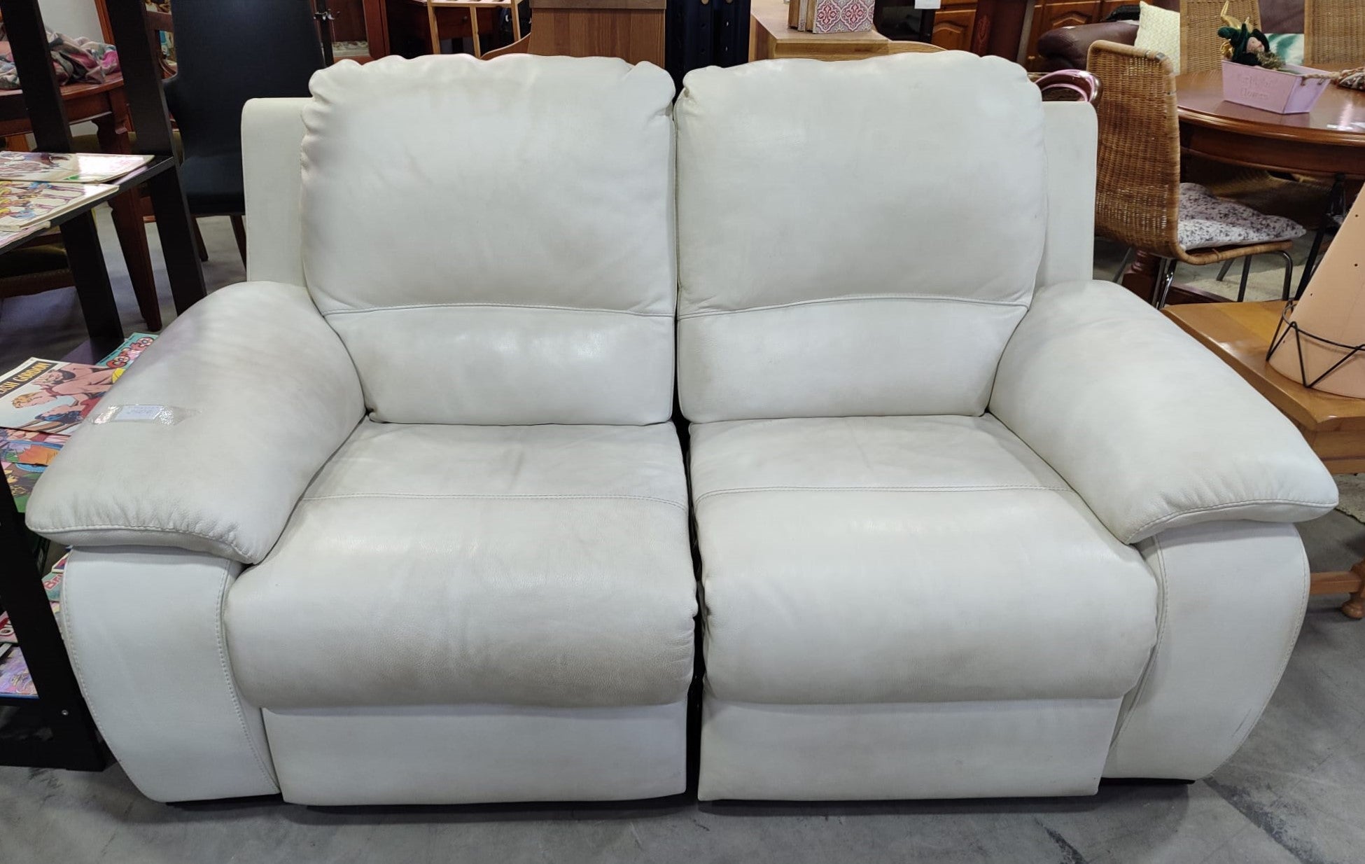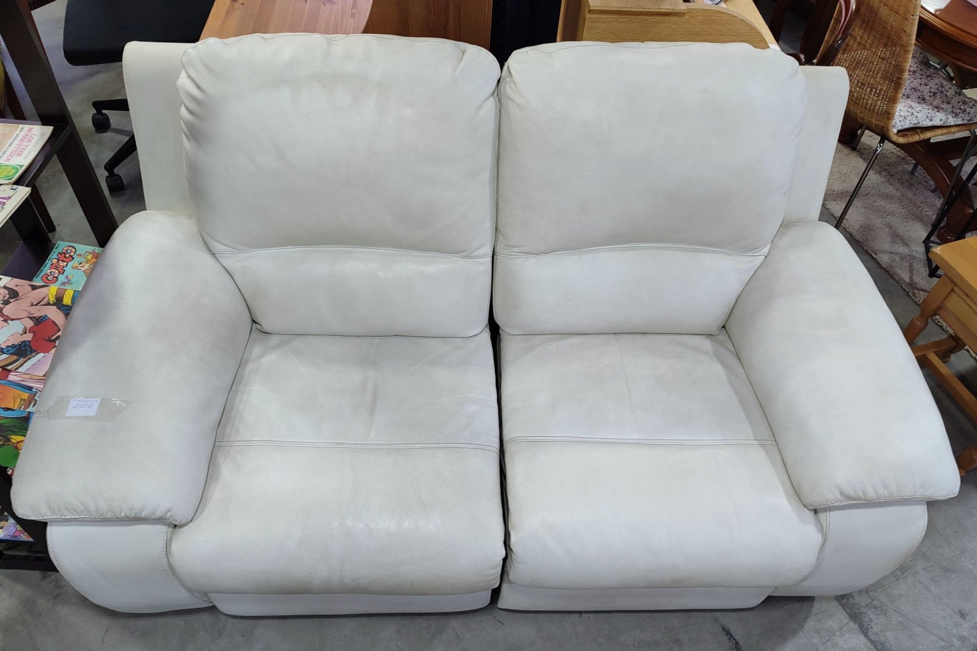 Descripción Sofá de dos plazas anchas, y bastidor metálico. Respaldo alto de doble cojín muy acolchado. Reclinable. Reposabrazos de almohadón acolchado. Asientos de espuma con reposapiés extensible. Separable en dos módulos independientes (80cm cada uno).Sis tema de extensión de fácil uso, tirando de la palanca que tiene el asiento en el lateral. Tapizado cosido de polipiel color blanco. Defecto: El tapizado presenta manchas y desgaste por el uso. Ver fotos.
