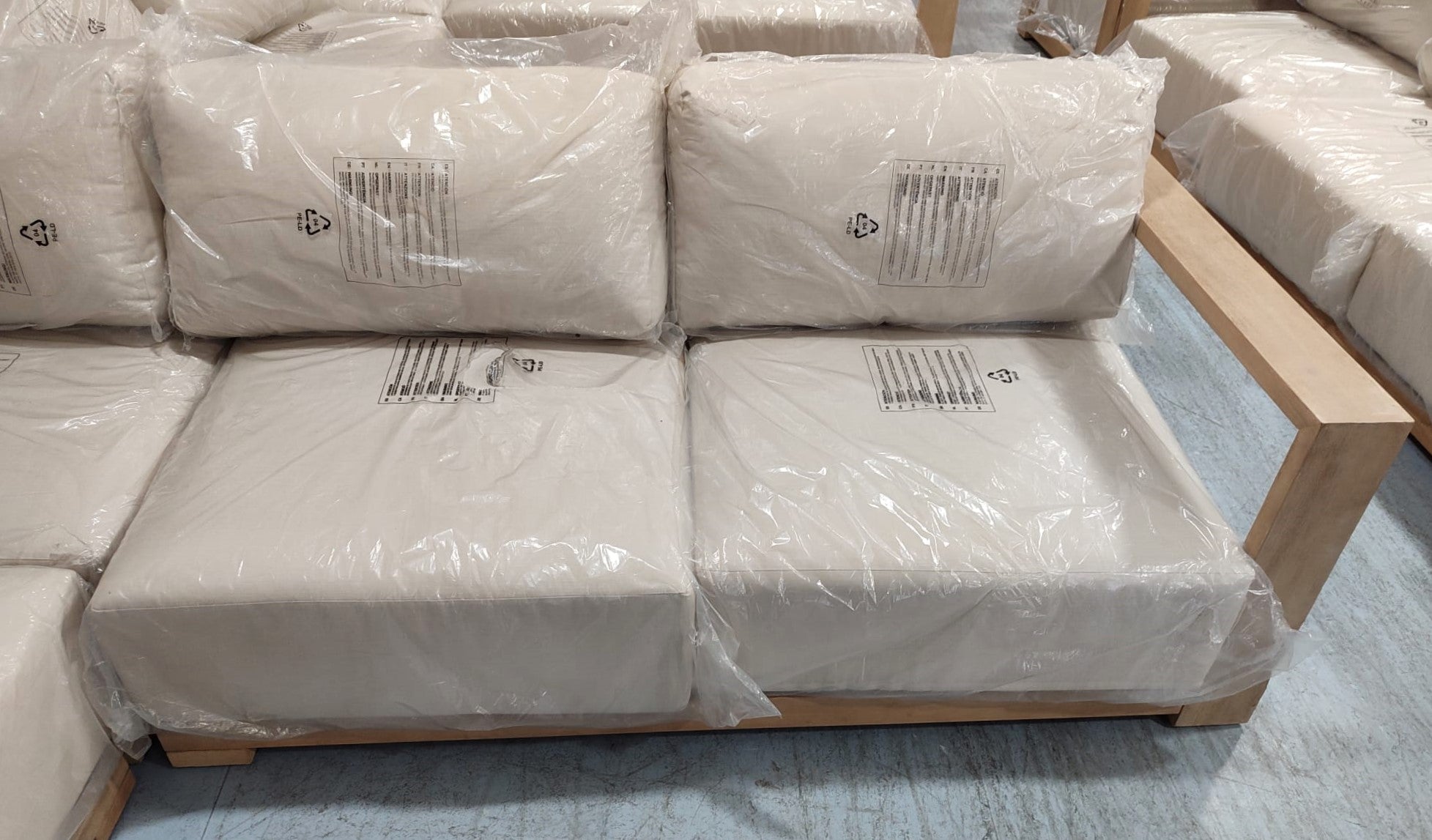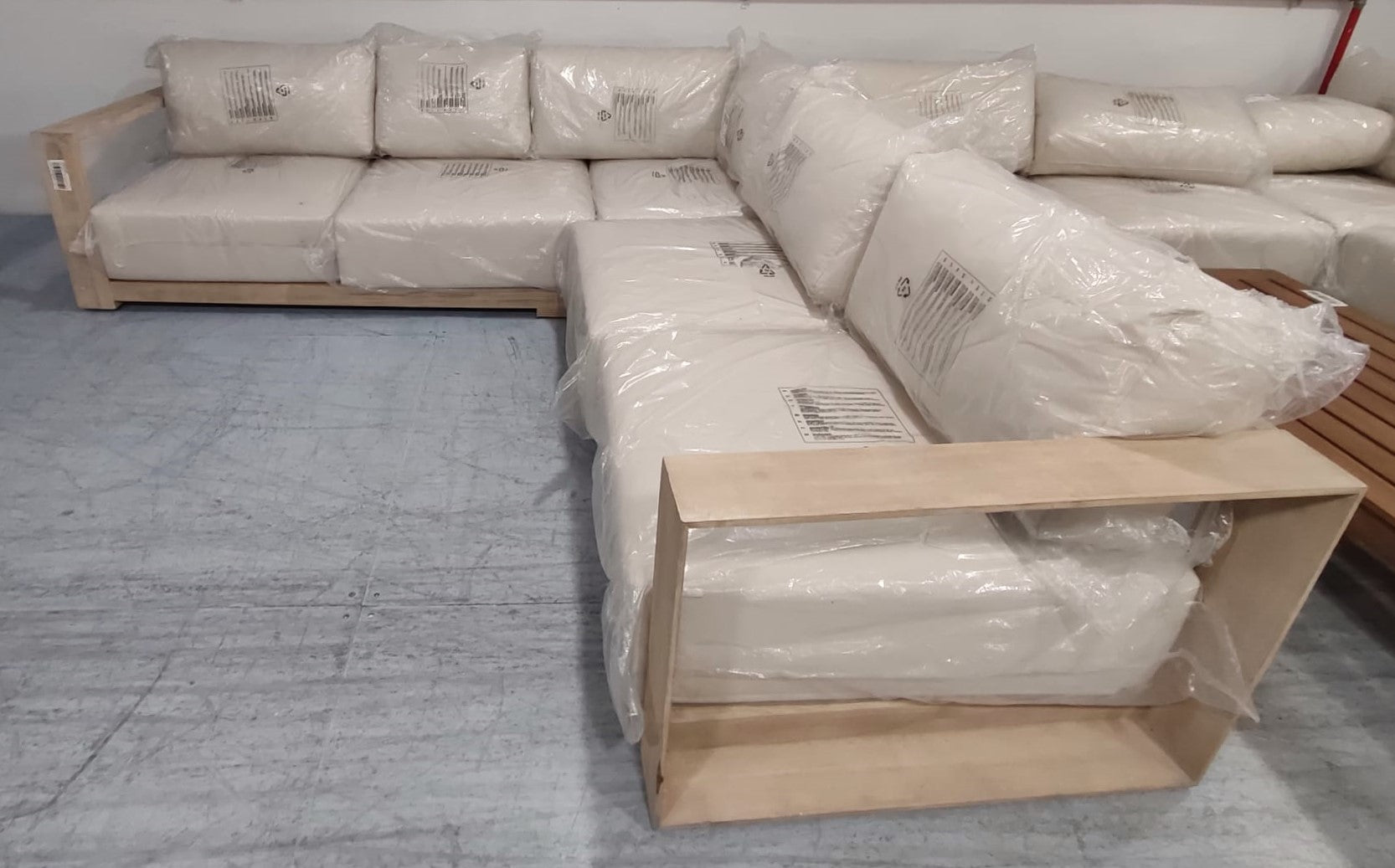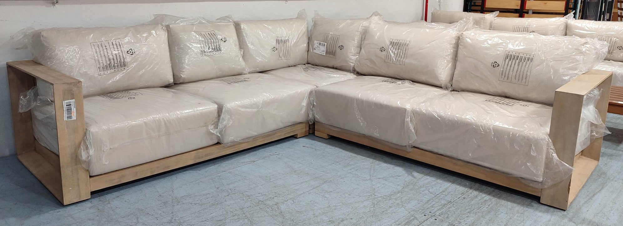 Descripción Sofá rinconero de 5 plazas hecho de madera maciza de acacia con acabado claro, separable en tres módulos. Ideal tanto para interiores como exteriores. Cojines del respaldo mullidos, rellenos de fibras acrílicas. Cojines de espuma de densidad media en el asiento. Todos los cojines son extraíbles y desenfundables. Recomendamos que los guardes en los días de lluvia. Se recomienda aplicar protector de madera al menos una vez al año para mantener su aspecto. Defecto: Una pata de uno de los módulos está astillada. Ver foto.