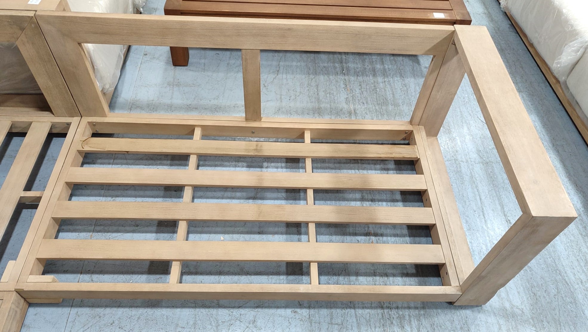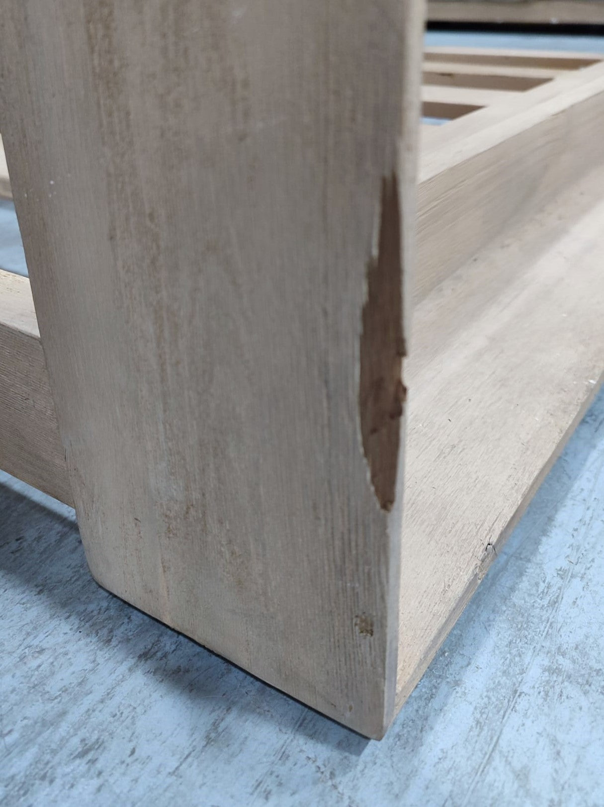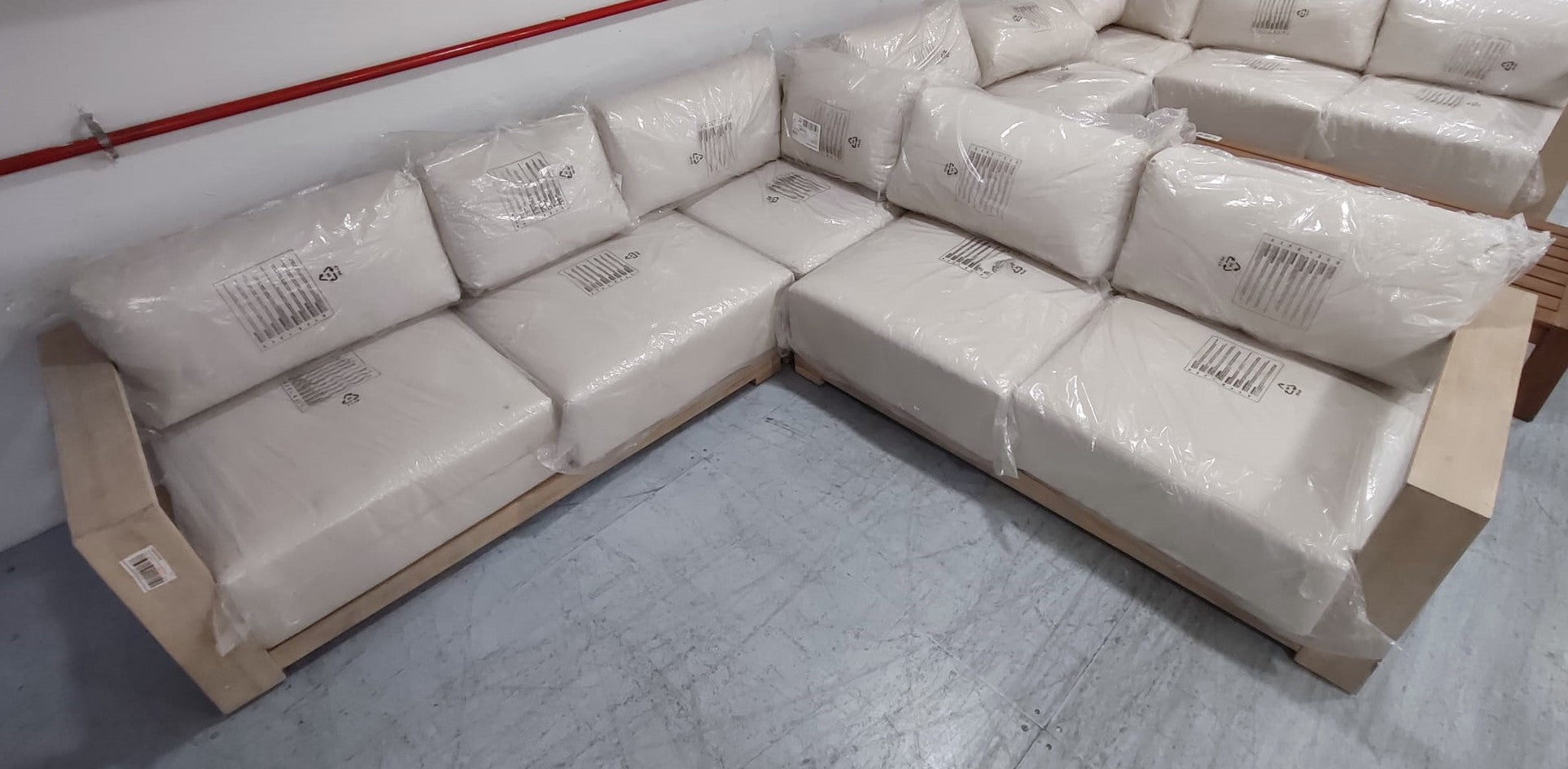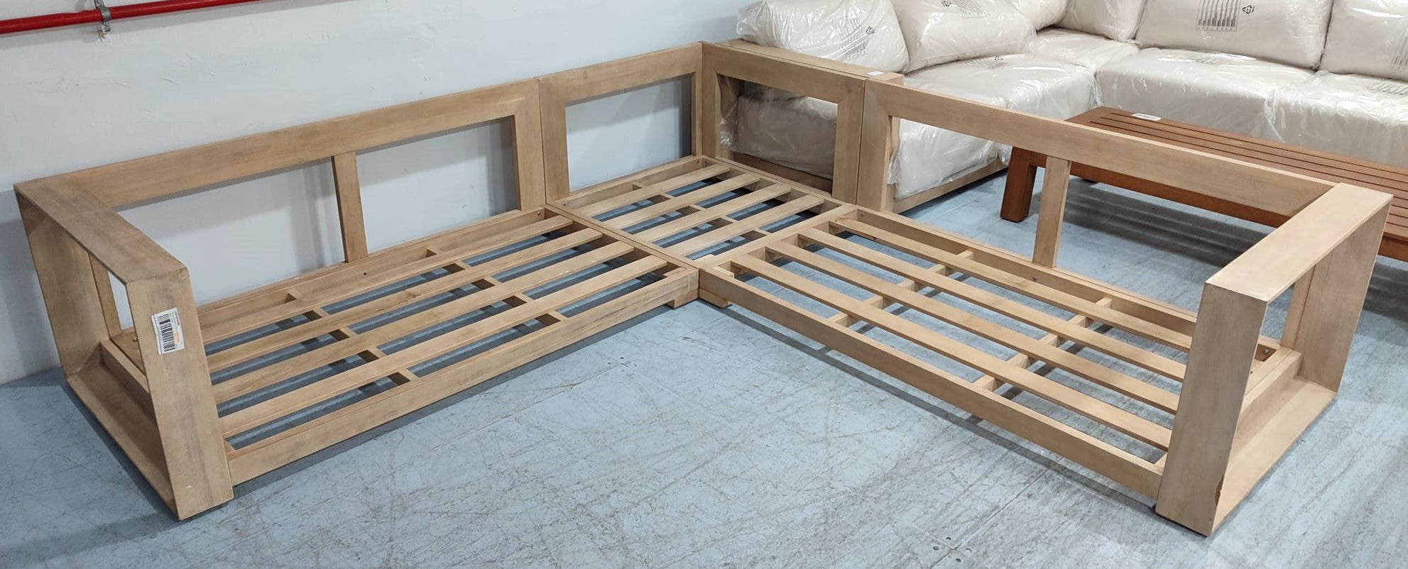 Descripción Sofá rinconero de 5 plazas hecho de madera maciza de acacia con acabado claro, separable en tres módulos. Ideal tanto para interiores como exteriores. Cojines del respaldo mullidos, rellenos de fibras acrílicas. Cojines de espuma de densidad media en el asiento. Todos los cojines son extraíbles y desenfundables. Recomendamos que los guardes en los días de lluvia. Se recomienda aplicar protector de madera al menos una vez al año para mantener su aspecto. Defecto: Una pata de uno de los módulos está astillada. Ver foto.