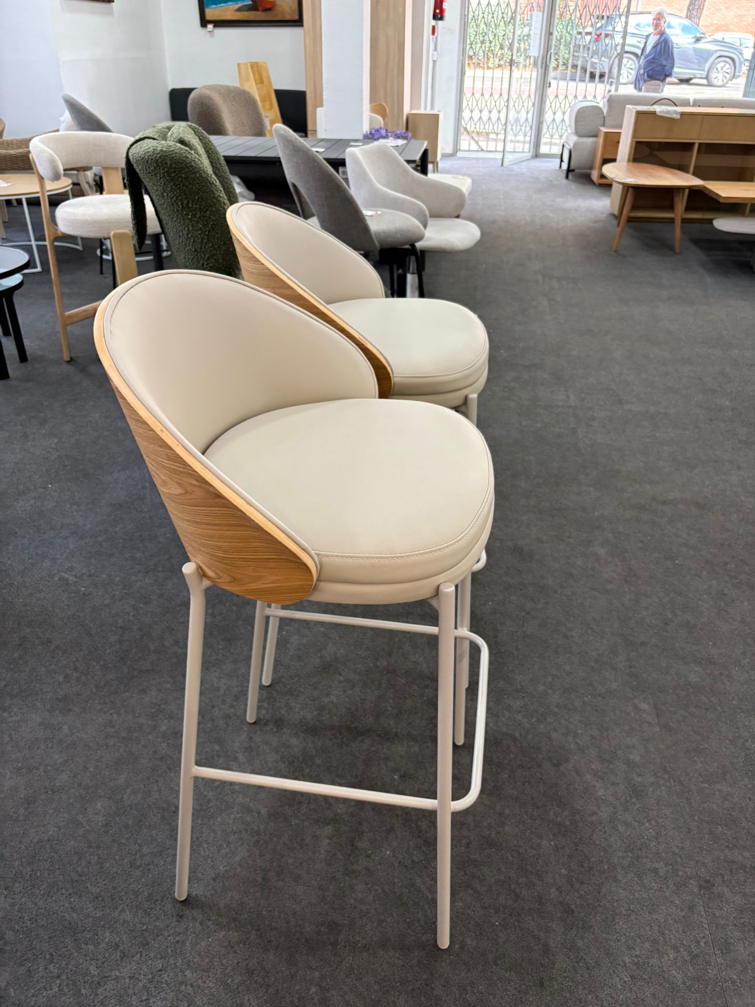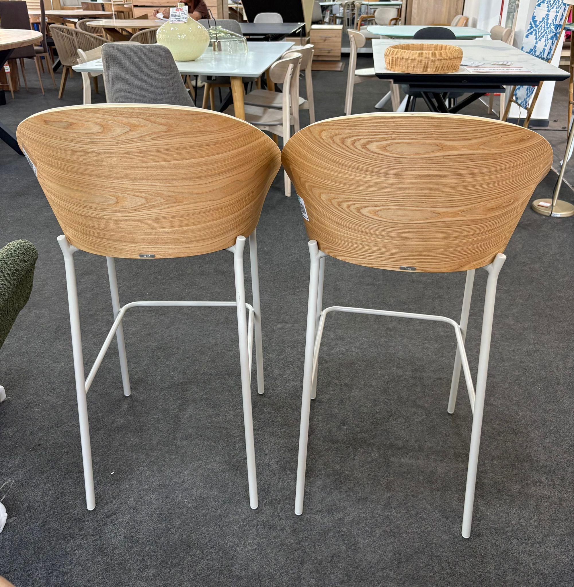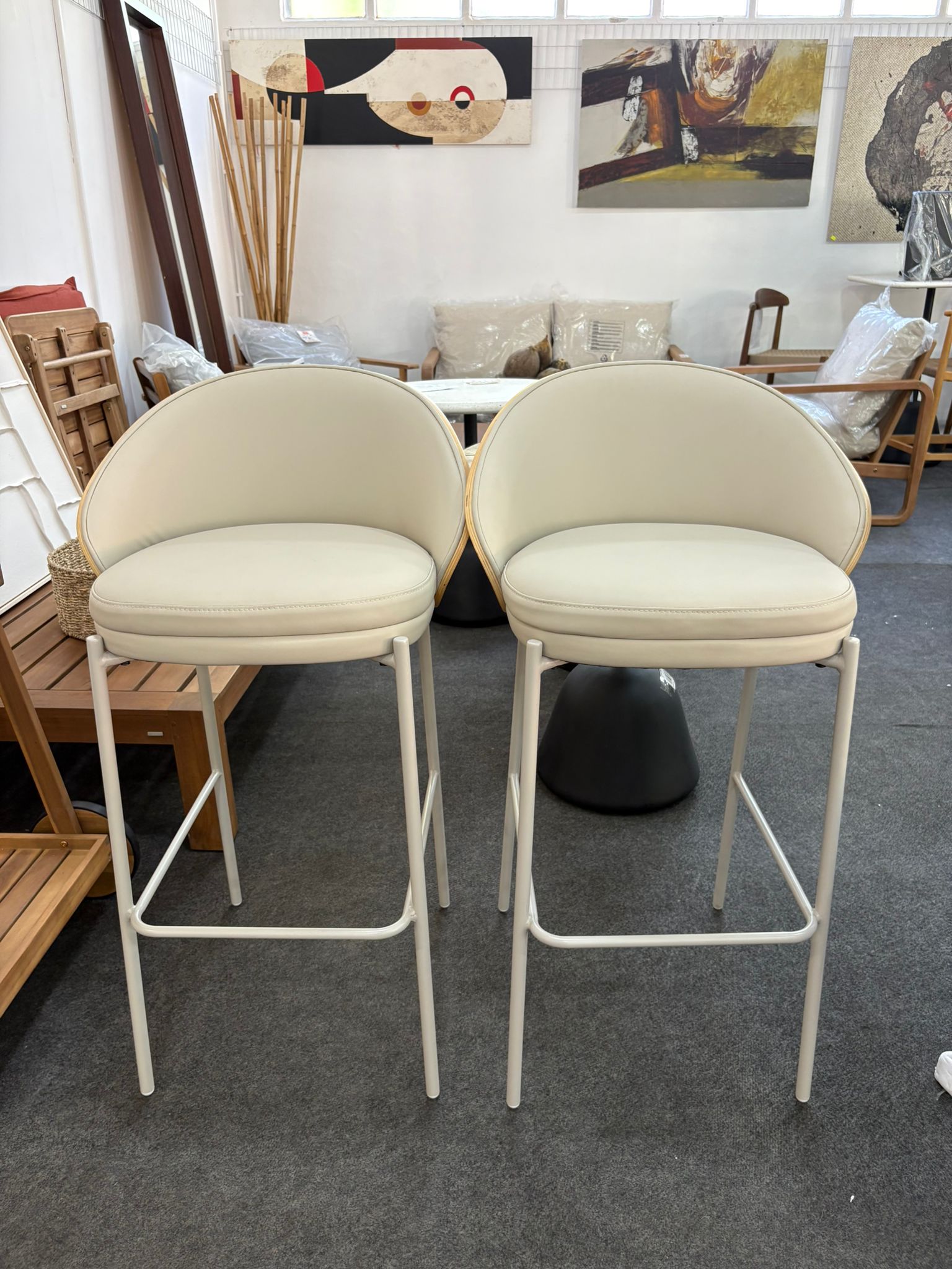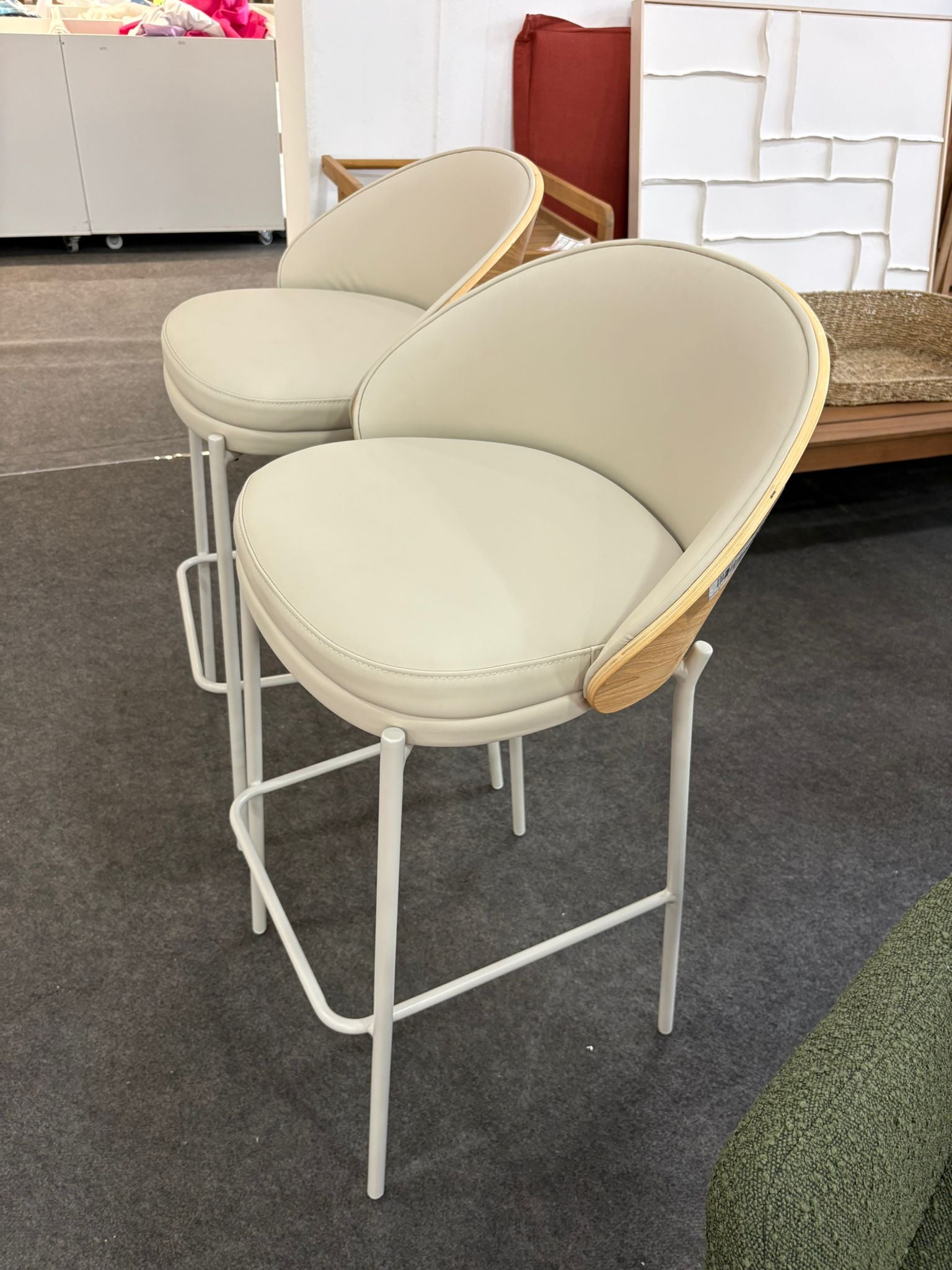 Descripción Taburete con respaldo chapado en fresno con acabado natural. Estructura metálica pintada en color beige. Tapizado en piel sintética marrón de alta resistencia a la abrasión. Se pueden comprar por separado, cada uno, 95€
