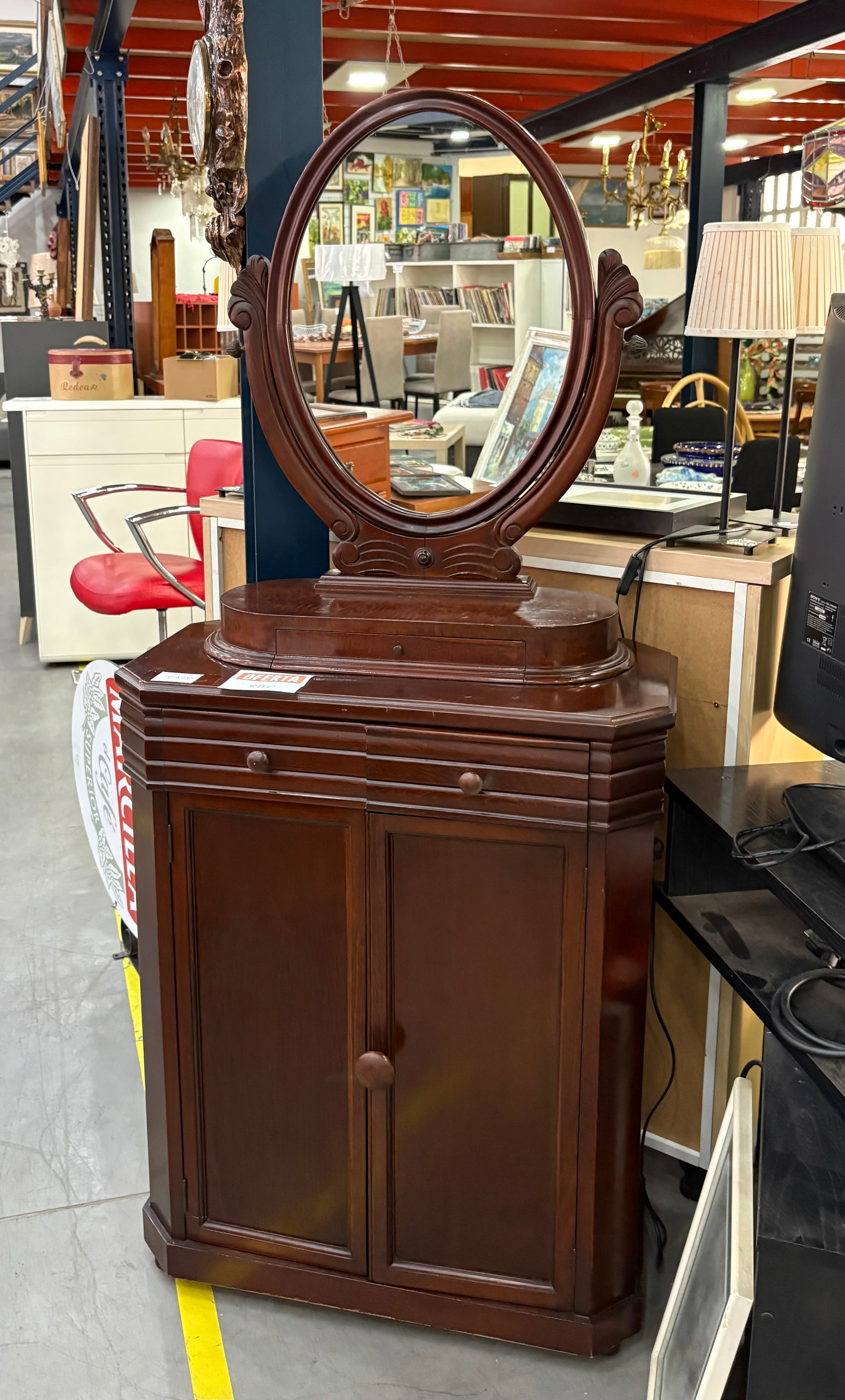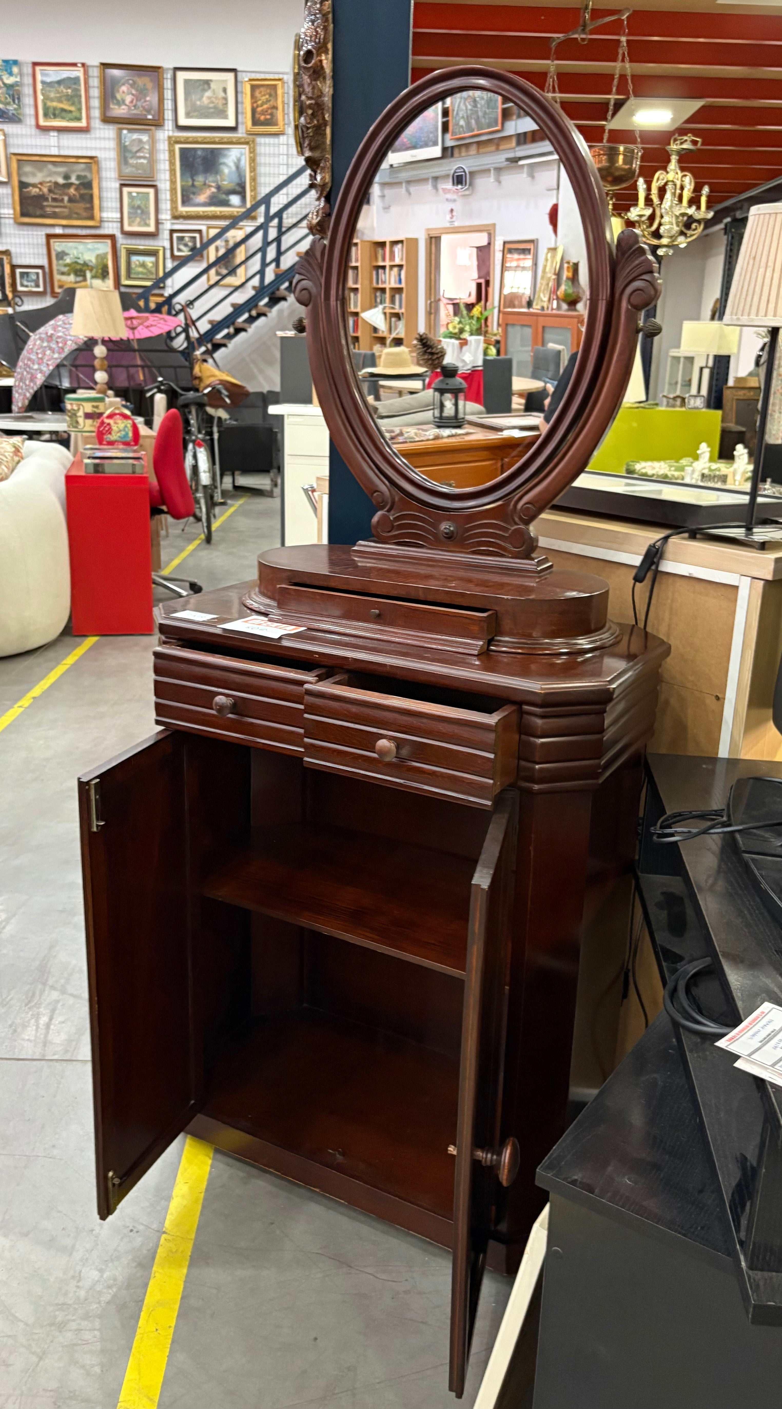 Descripción Tocador de madera con espejo tiene cajones y baldas de almacenamiento. Estilo vintage. Defecto: La manija de las puertas está suelta.