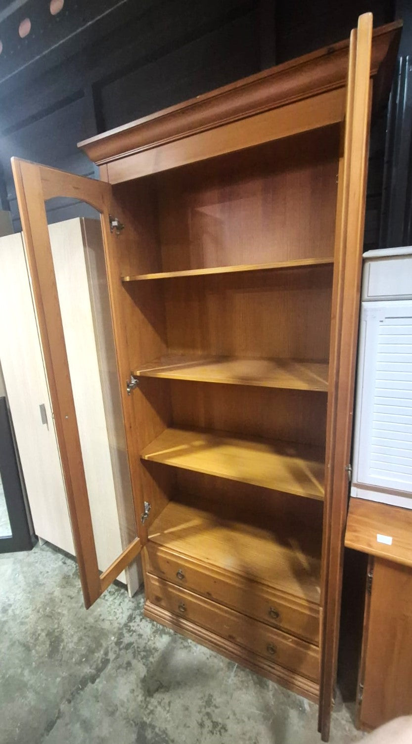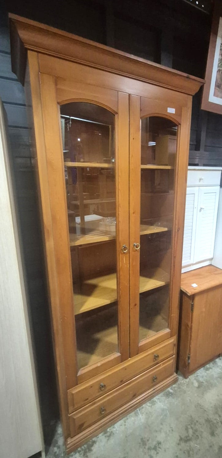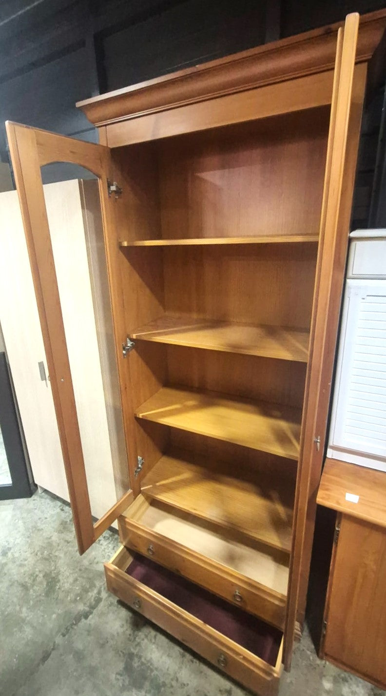 Descripción Mueble de estilo clásico, hecho de madera aglomerada con acabados de melamina. Puertas acristaladas, abatibles. Espacioso interior con 4 baldas de madera. 2 cajones inferiores.